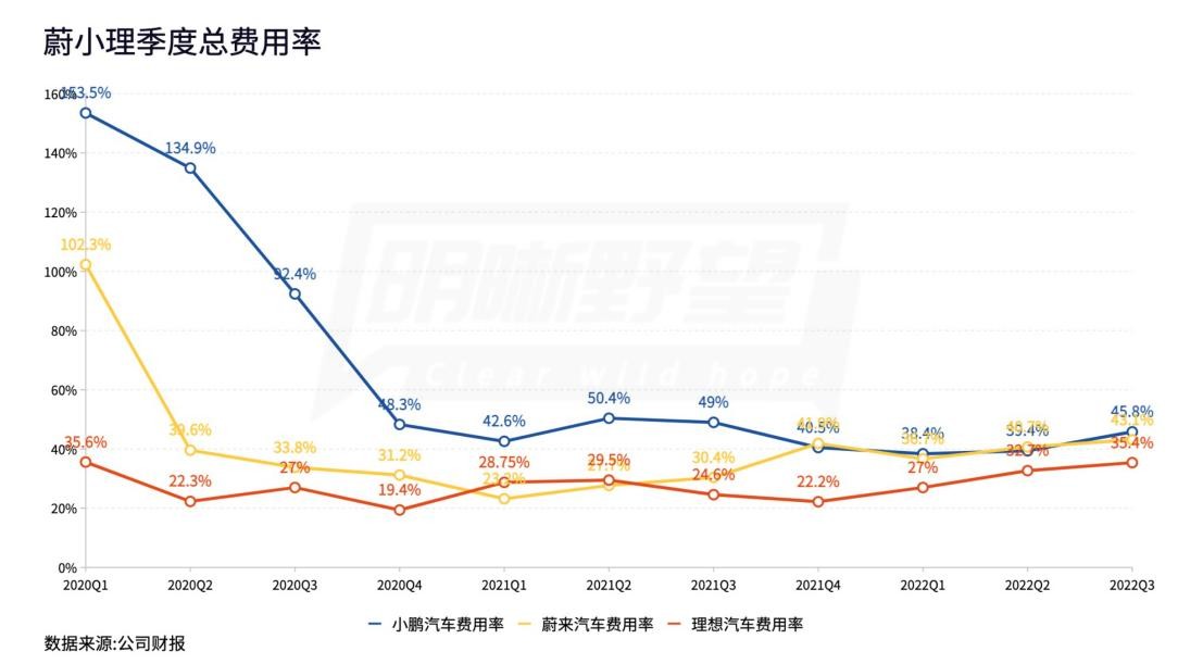 今年以来,“蔚小理”三家的费用率都在逐季增加,说明面临的各方面挑战愈加严峻。