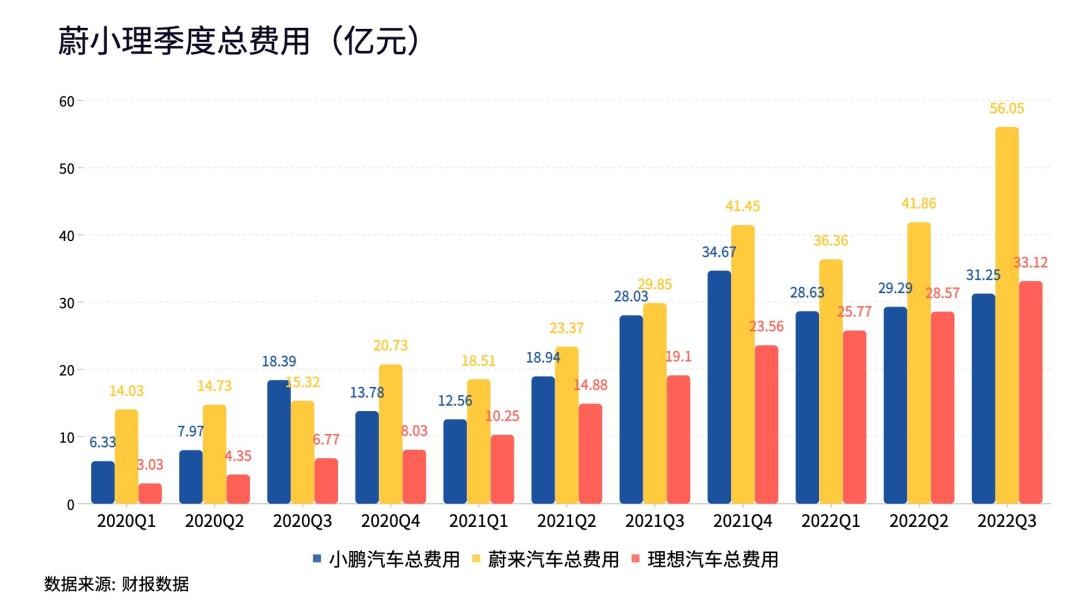在“蔚小理”中,理想一直有着最低的费用率,但Q3总费用还是超过了小鹏,达到33.1亿元,同比增长73.4%。