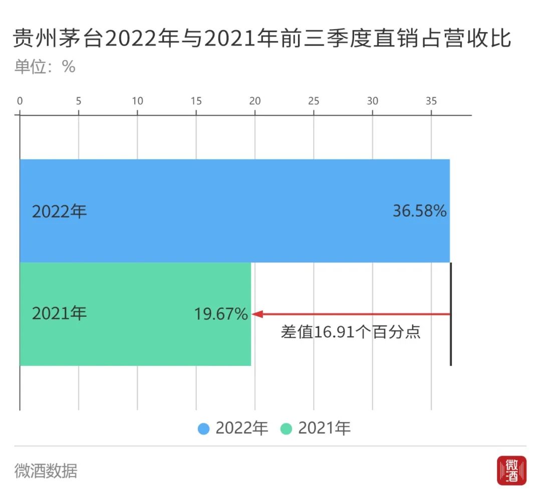一是直销占比的显著提升。贵州茅台在2022年前三季度的直销收入营收占比为36.58%,比去年同期的19.67%上升了16.91个百分点,这还只是i茅台在第二、三季度运行的结果。