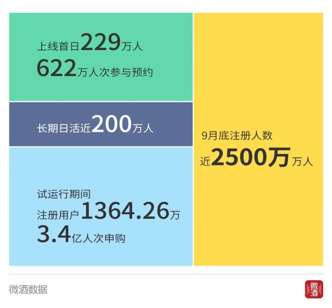 从APP用户数据来看,仅试运行期间,i茅台注册用户就达到了1364.26万,预约申购人数达到3.4亿人次;而到9月底,注册人数已经接近2500万;