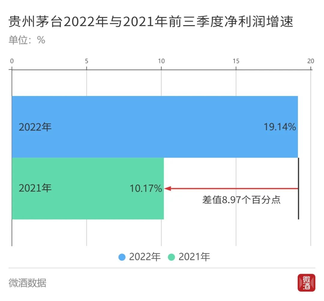 与直销占比相对应的是盈利能力。贵州茅台在2022年前三季度的净利润同比增长19.14%,比去年同期的10.17%上升了8.97个百分点——在以数百亿元为基数的前提下,这样的增长是十分惊人的。