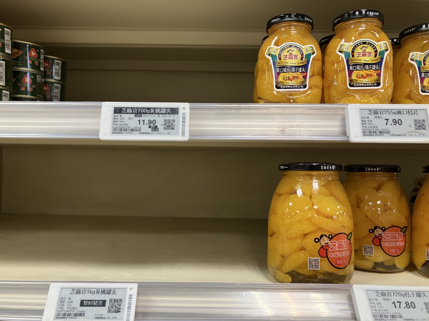 界面新闻走访了北京京客隆、首航两家本地超市发现,黄桃罐头所在的货架均为缺货状态,在京客隆超市,罐头品牌芝麻官的货架位置,仅剩下3类不同规格的桔片罐头,相对应的黄桃罐头尚未补货。