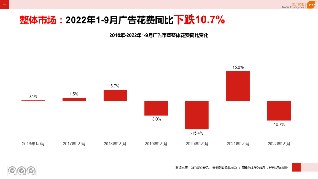广告是经济的晴雨表,与经济状况强相关。受国内经济大环境影响,今年的广告行业整体呈衰败趋势,根据CTR媒介智讯的数据显示,2022年1-9月广告市场同比减少10.7%