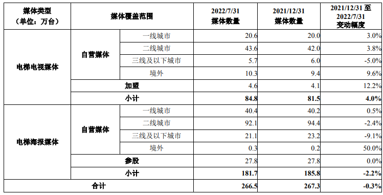 此外,分众海外业务广泛,截至 2022 年 7 月 31 日,公司的生活圈媒体网络除了覆盖国内主要的 302 个城市以及香港特别行政区 以外,还覆盖了韩国、泰国、新加坡、印度尼西亚和马来西亚等国的 50 多个主要城市。