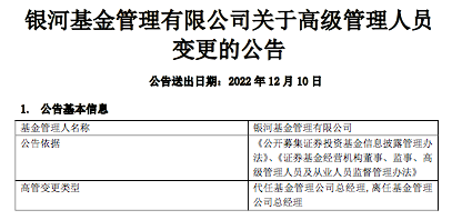 12月10日,银河基金发布公告称,原公司总经理于东升因个人原因于12月9日离任,总经理一职暂由董事长宋卫刚代任。