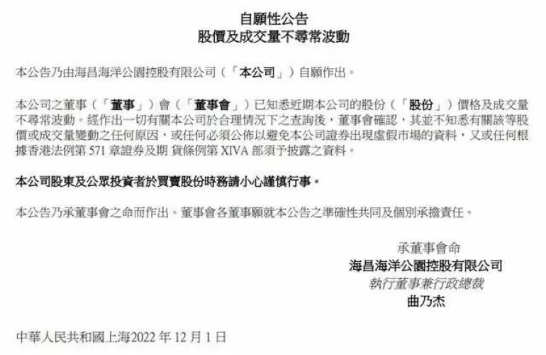 海昌海洋公园在公告中称,董事会已知悉近期公司的股份价格及成交量不寻常波动。经作出一切有关公司于合理情况下之查询后,董事会确认,并不知悉有关该等股价或成交量变动的任何原因,或任何必须公布以避免公司证券出现虚假市场的数据,又或任何须予披露的资料。