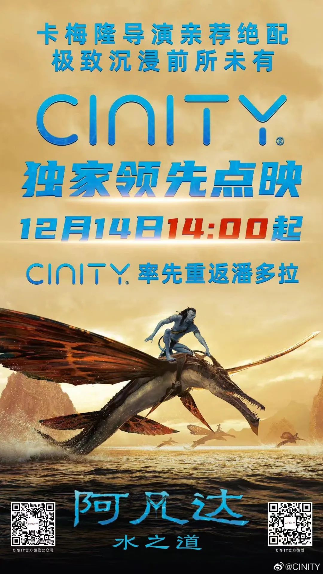 日前,在CINITY官方微博上,宣布CINITY将于12月14日14点起独家领先点映《阿凡达2》。之后据一位院线行业的自媒体博主表示,IMAX和杜比视界等影厅将晚于CINITY,在同日17点后开启点映。