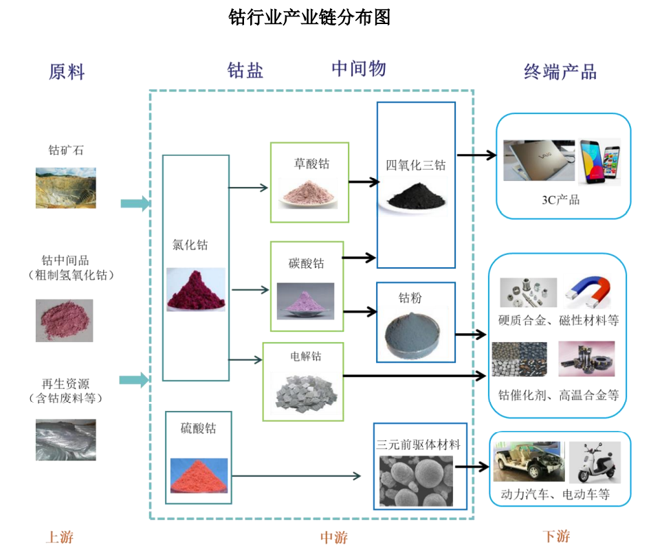 钴是电池的重要原材料。钴具有铁磁性和延展性,电化学性能良好,因此钴及钴盐等化合物被广泛应用于电池材料、磁性材料、化学制品等领域。此外,钴与其他金属的合金具有高温强度高、耐热性好、硬度大、耐腐蚀性高等特点,故钴是制造高温合金、硬质合金、金刚石工具等的重要原料。
