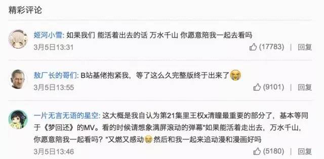 这种请“圈内人”来创作演绎的做法,成功地创作出了非常符合粉丝审美的音乐作品。无论是QQ音乐,还是网易云音乐,甚至是B站搬运的音乐视频,都有不少粉丝把动画中的台词作为评论或是弹幕。有《狐妖小红娘》的粉丝向ACGx表示,他们认为这些音乐内容与动画内容十分契合,而在评论区刷经典台词,则是他们对这些音乐表达“爱”的最好方式。