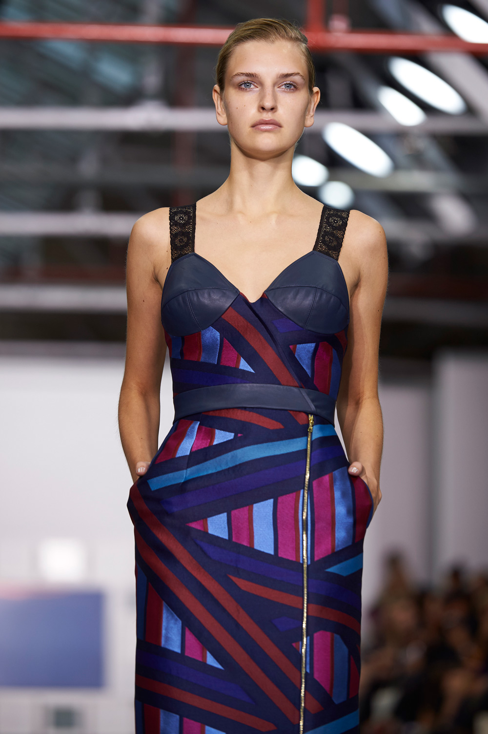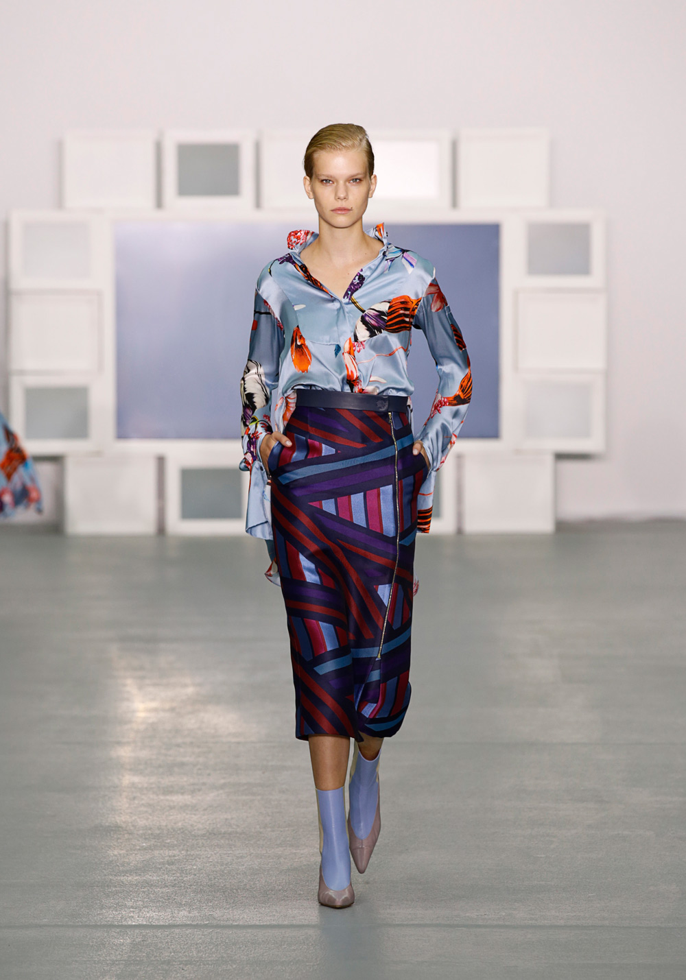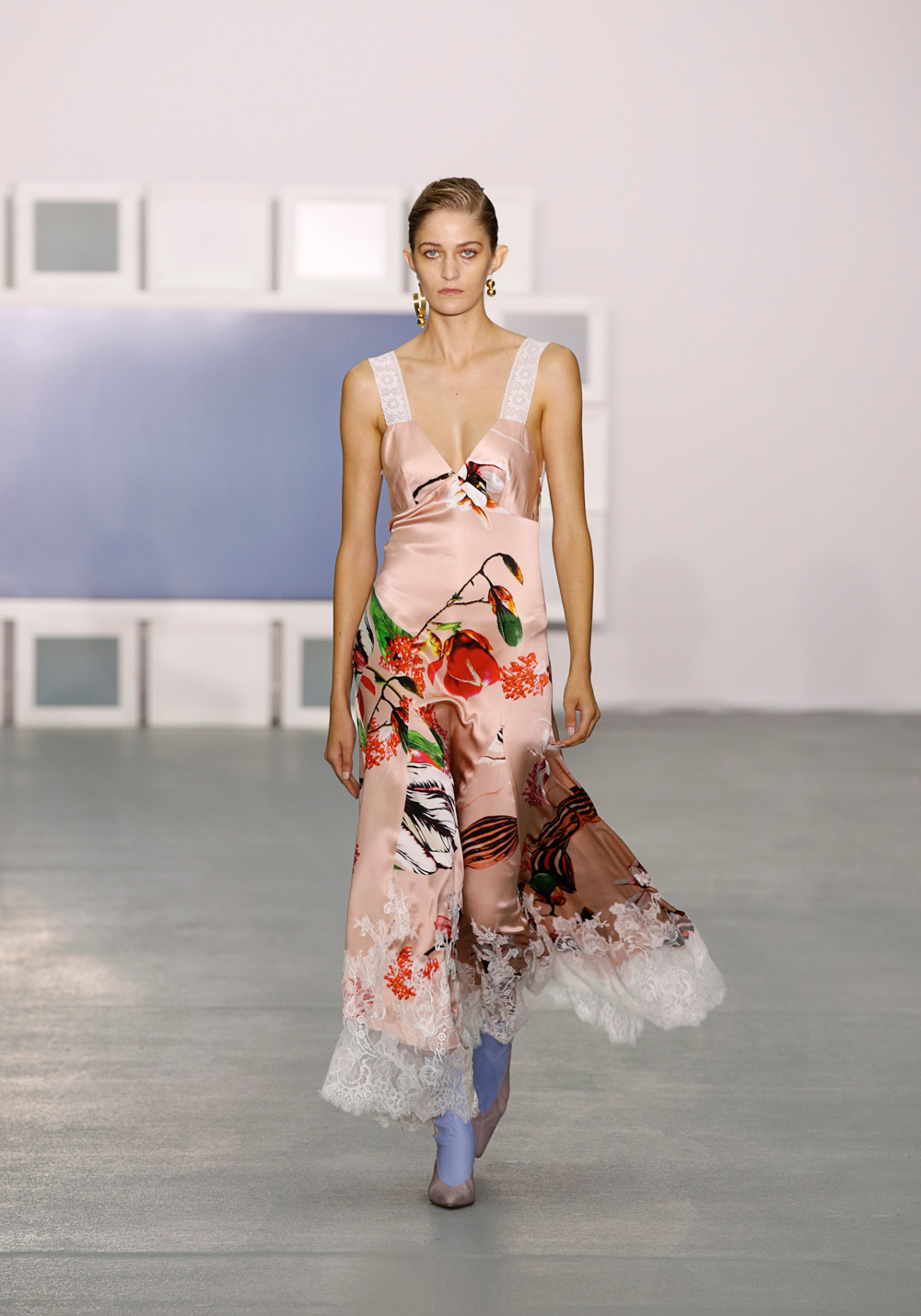 紧扣季节主题上台的第一组时装带有浪漫的花草图案和抽象景观,如果你熟悉苏格兰艺术的话,或许能从中联想起20世纪初Charles Renee Mackintos的水粉作品。随着几个图案光鲜上场,风格从原先的淡雅转向喧嚣,用作肩带和藏在裙褶间的法国蕾丝含蓄地带出摩登时代的声色犬马。