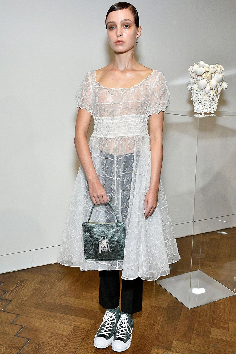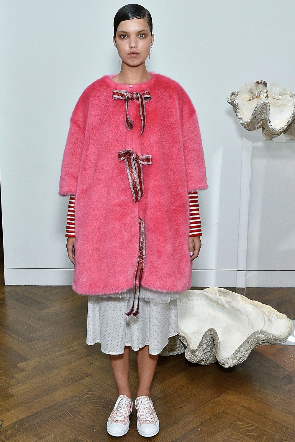 本次发布现场里放置了7、8件大小各异的贝壳。模特身上无论是薄如蝉翼的白色蕾丝裙装、印花丝质睡衣,还是火烈鸟色的皮草,看上去都趣味十足,同时兼具商业特性。按照媒体公告上的预示,最新的这一系列还与18世纪法国宫廷有关,衣服中不少褶边立领运用自然得到解释。