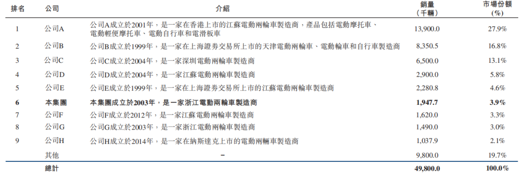 根据弗若斯特沙利文的资料,其中前9大厂商共占据80.3%的市场份额,以2021年的电动两轮车销量计,绿源集团只能排名第六。