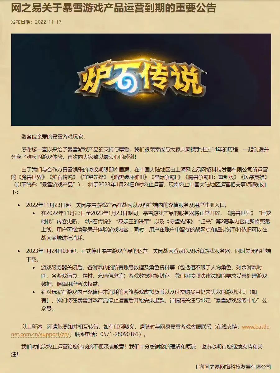 11月17日,暴雪宣布结束与网易的代理合作,至今未有下文,这意味着无数的中国暴雪游戏玩家将在明年1月23日之后面临“无家可归”的境地。