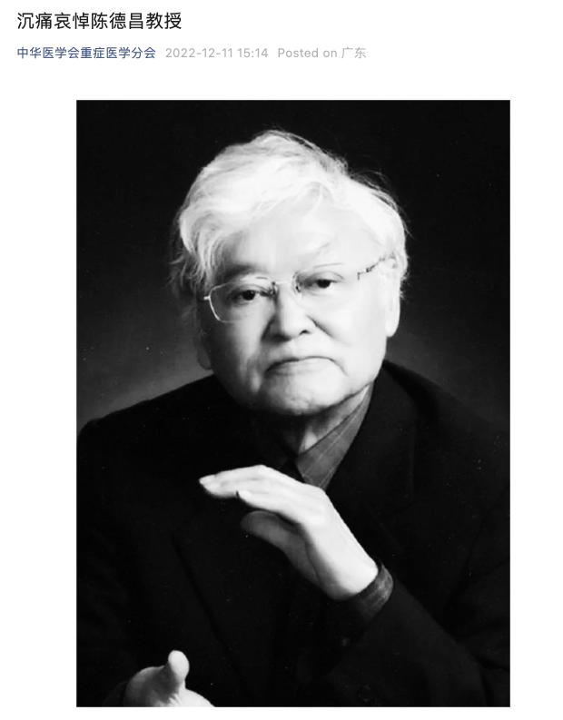 中华医学会重症医学分会官微12月11日消息,中国共产党优秀党员、中国重症医学的开拓者、缔造者和奠基人,北京协和医院主任医师、教授、博士研究生导师,陈德昌教授因病于2022年12月10日23时06分在北京逝世,享年90岁。