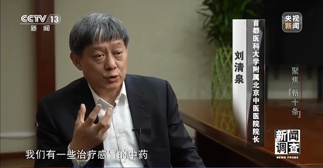 首都医科大学附属北京中医医院院长 刘清泉:我们有一些治疗感冒的中药,尤其是治疗风热感冒的,你看里面的说明书,有疏风、清热、解表、化湿、清瘟,具有这一类任何2—3个功效的中成药物,我们都可以来服用。