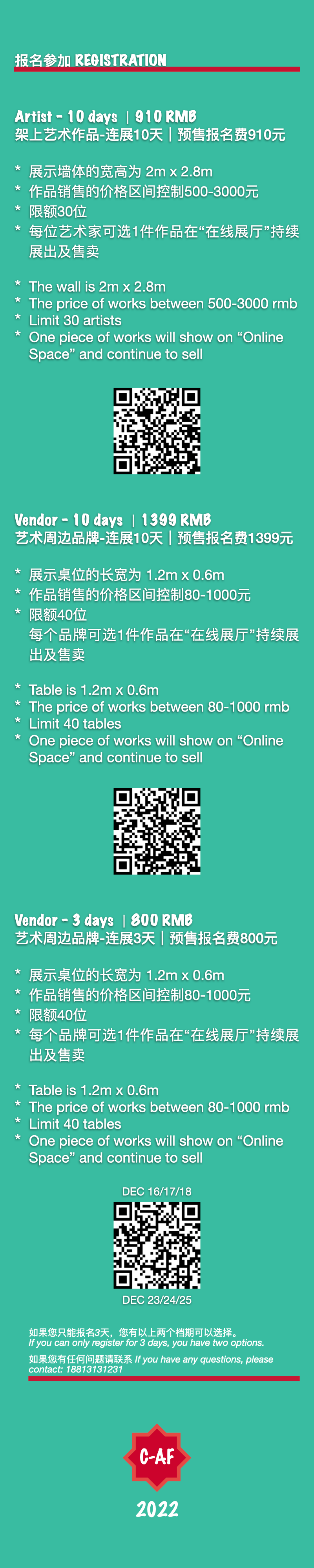 本次“C-AF2022”由展览、市集、表演以及默拍四个内容单元构成。我们将于12月16号-12月25号在北京胡同艺术空间里为大家持续呈现10天。
