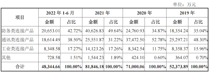 华丰科技的主要产品按应用领域可分为三类:防务类连接产品、通讯类连接产品和工业类连接产品。报告期各期防务类连接产品及通讯类连接产品收入较高,占主营业务收入比重均超80%。