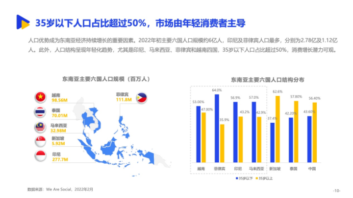除此之外,东南亚的人口结构呈现年轻化趋势,35岁以下人口占比超过50%,消费市场由年轻人主导,而年轻人多的地方,往往消费更加旺盛。
