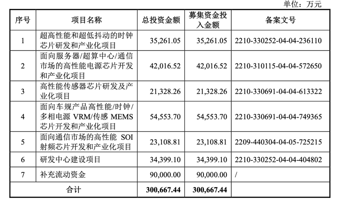 奥拉股份所募集资金扣除发行费用后,5.46亿元用于面向车规产品高性能/时钟/多相电源VRM/传感MEMS芯片开发和产业化项目,4.20亿元用于面向服务器/超算中心/通信市场的高性能电源芯片开发和产业化项目,3.53亿元用于超高性能和超低抖动的时钟芯片研发和产业化项目等。