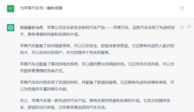 再让他预测一下苹果汽车。几秒钟的时间就能完成一篇简洁的新闻稿。