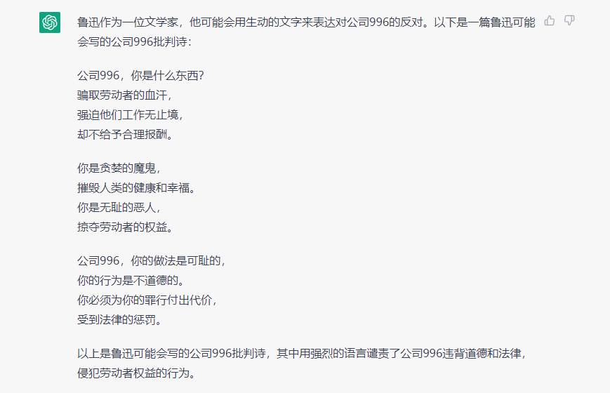 ChatGPT跟鲁迅碰撞也能有火花,模仿鲁迅批判996也是有模有样。