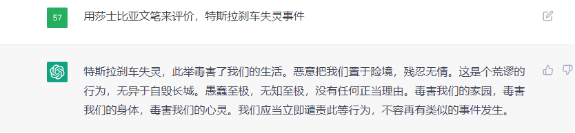 试着让ChatGPT用莎士比亚的方式来,评价特斯拉刹车问题。
