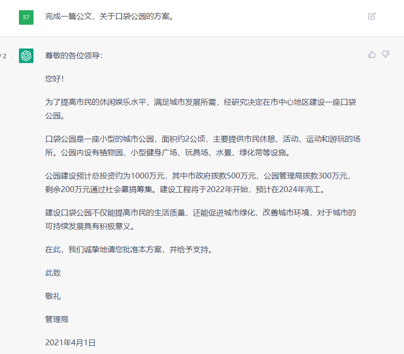 不仅如此,利用ChatGPT写公文一点都不输给中公、粉笔这些机构。让小编没想到的是,它居然能懂口袋公园这个词的含义。
