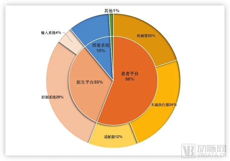 直观外科公司在手术机器人领域的专利主要集中在腔镜手术机器人这一领域。通过直观外科公司在此领域的约1400件专利申请进行大致分类,可以看到直观外科公司围绕其核心技术在患者平台系统、医生平台系统以及图像系统三个主要分支均进行了全面的布局。其中,围绕作用对象的患者平台系统是该公司的研发重点,专利申请占比为56%。