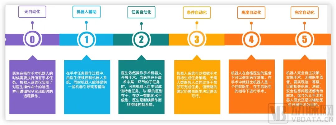 《Science》杂志子刊《Science Robotics》曾经刊登过一篇文章《Medical robotics—Regulatory, ethical, and legal considerations for increasing levels of autonomy》,文章着重思考了医疗机器人自动化分级到问题,并定义了6种医疗机器人自动化程度。从趋势来说,手术机器人也在朝自动化、智能化,减少医生手动操作的路径上发展。