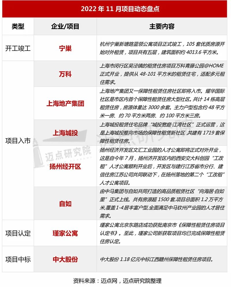 11月,住房租赁项目入市成为本月热点。竣工方面,杭州市上城区宁巢新塘路蓝领公寓项目正式竣工,105套优质房源即将对外租赁。开业方面,上海地区迎来项目集中开业。11月1日,上海市闵行区吴泾镇的租赁住房项目万科青藤公园@HOME正式开业,提供从48-101平方米的租赁住宅。此外,上海城市租赁住宅标杆项目、上海城投保障性租赁住房“城投宽庭·江湾社区”落成投用,这也是上海城投首个入市的保障性租赁住房项目。“城投宽庭·江湾社区”位于新江湾城核心区域,共建有1719套保障性租赁住房,打造一房(约29-63㎡)、两房(约73㎡)、三房(约98㎡)多种户型。