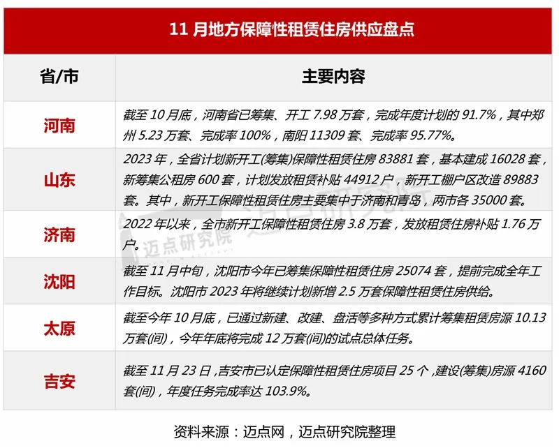 11月,河南、山东、济南、沈阳、太原、吉安等省市继续公布保障性租赁住房的筹集进度和供应计划。其中,沈阳和吉安已提前完成年度保租房筹集目标。