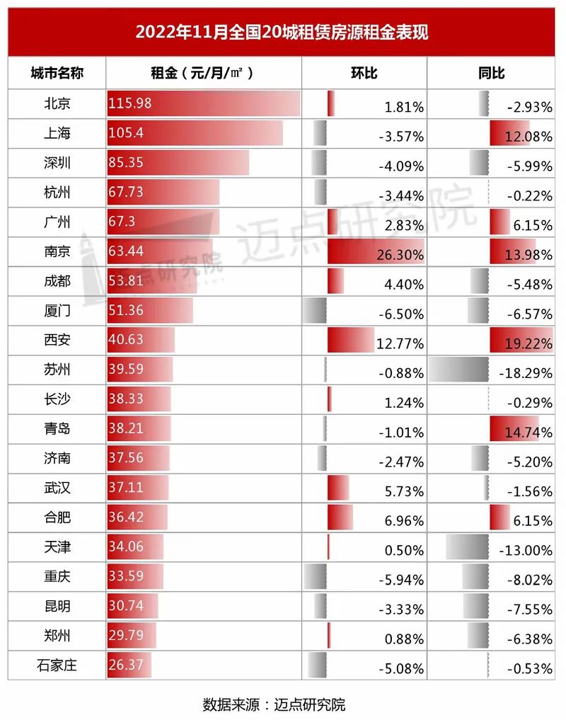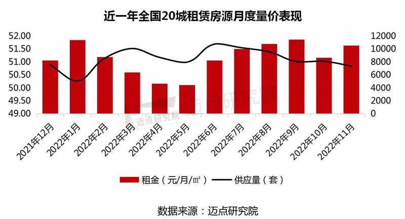 受到季节性租赁需求回落的影响,11月整体租赁市场逐步进入年底淡季,一线、二线城市租金继续下滑。同比2021年同期,只有一线城市恢复到去年同期水平。