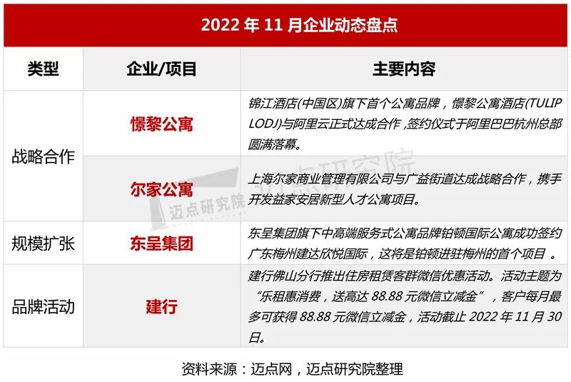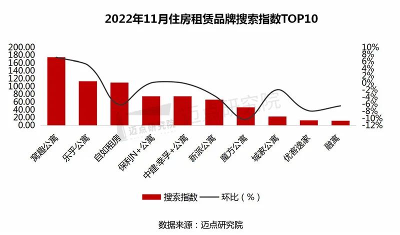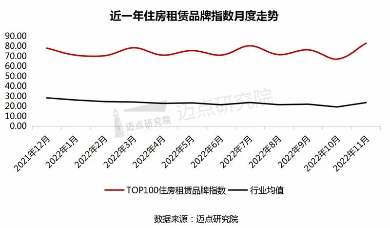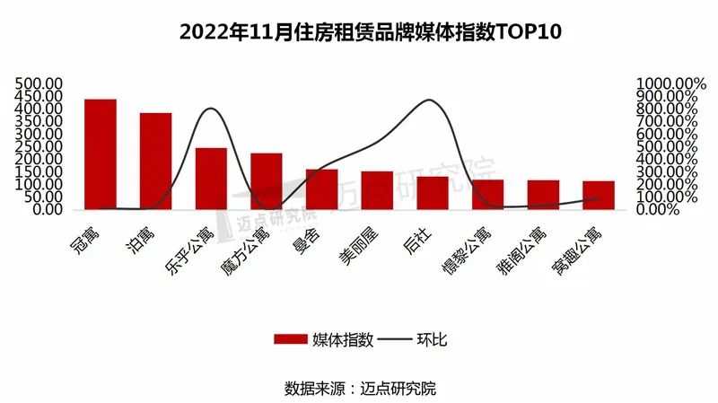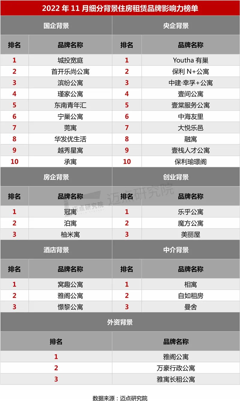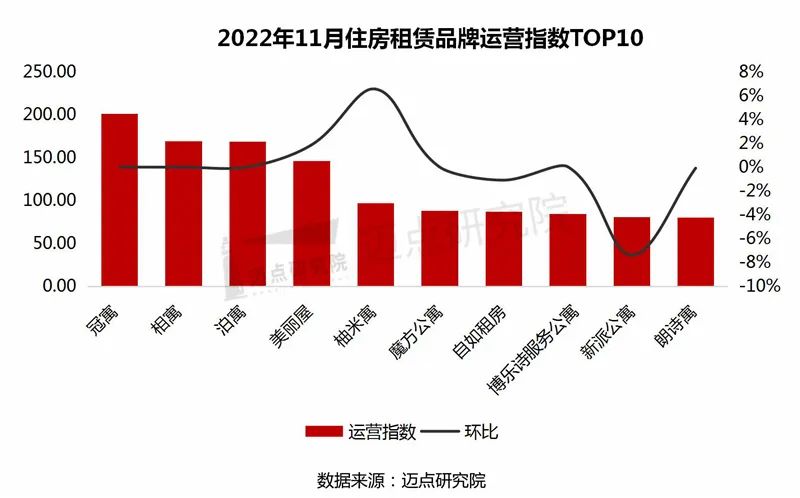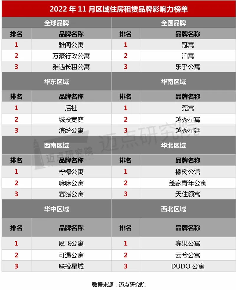 以下是迈点研究院独家发布的“2022年11月住房租赁品牌影响力(MBI)100强榜单”。本月冠寓、泊寓、乐乎公寓、魔方公寓、窝趣公寓、美丽屋、相寓、自如租房、新派公寓、曼舍进入榜单前十。
