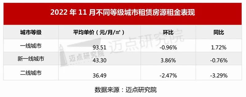 从不同线级城市的租金来看,2022年11月,受到租赁淡季的影响,一线、二线城市租金水平继续下降,尤其是二线城市,下降幅度较大。