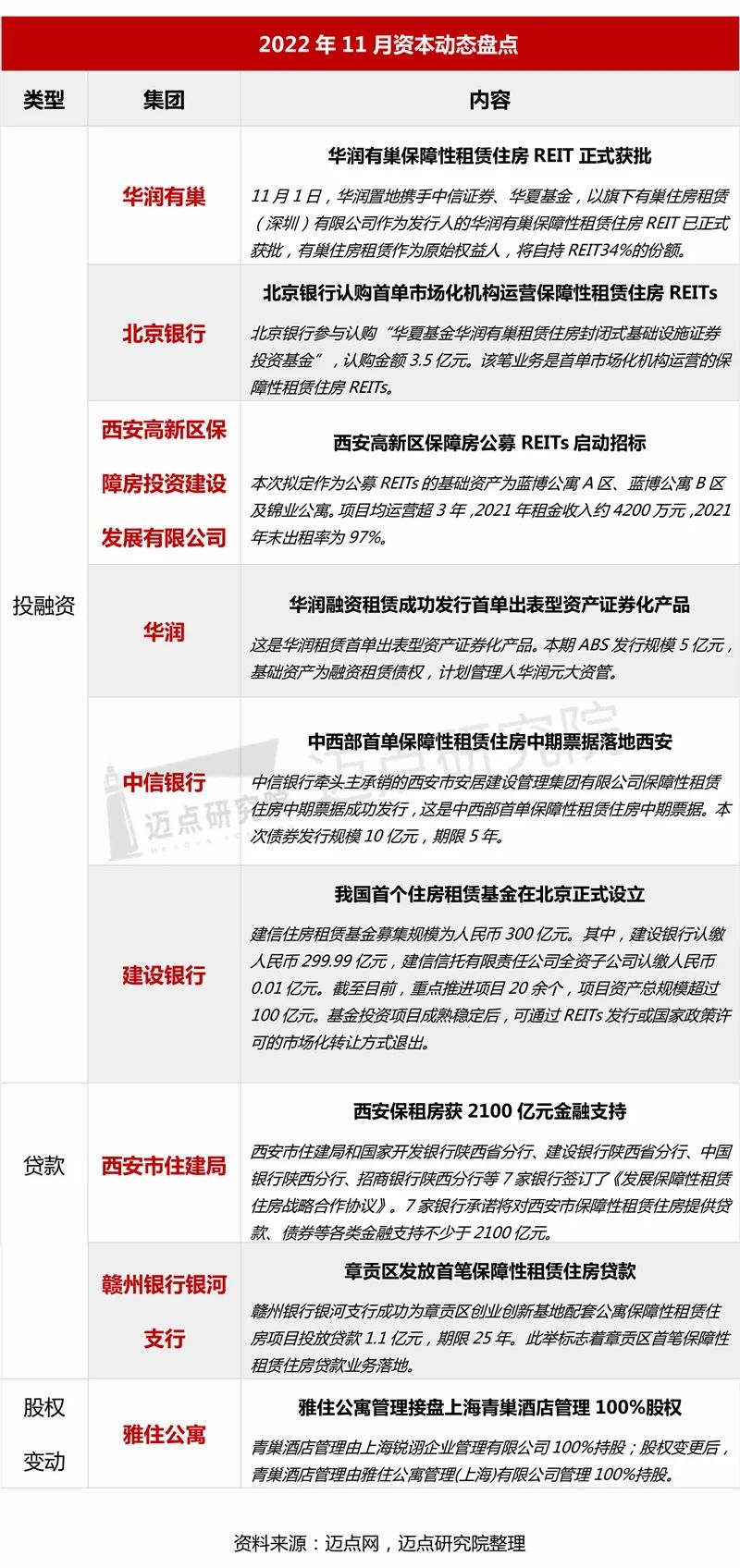 11月,华润有巢REIT正式获批,保租房REITs即将迎来第四位新成员。与此前三单公募REITs一样,华润有巢此次的REITs产品审批过程也很快,成为国内首单市场化机构运营的保障性租赁住房REIT。华润有巢REIT于12月9日在上海证券交易所上市。此前3只保租房REITs上市后的良好表现,让投资者对华润有巢REIT上市后表现充满期待。由于华润是以住宅开发为主业的房地产企业,此次也是首家涉水公募REITs市场房企系的租赁企业,为后续房企租赁运营品牌融资提供新的渠道,有利于引导社会资本积极参与保障性租赁住房的建设运营。