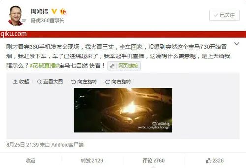2015年8月,周鸿祎在巡视完360手机发布会现场后回家的路上,他所乘坐的宝马车发生了自燃。面对这样的情况,周鸿祎举起手机开始直播。这场直播不仅吸引了众多网友,就连王思聪也赶来围观。