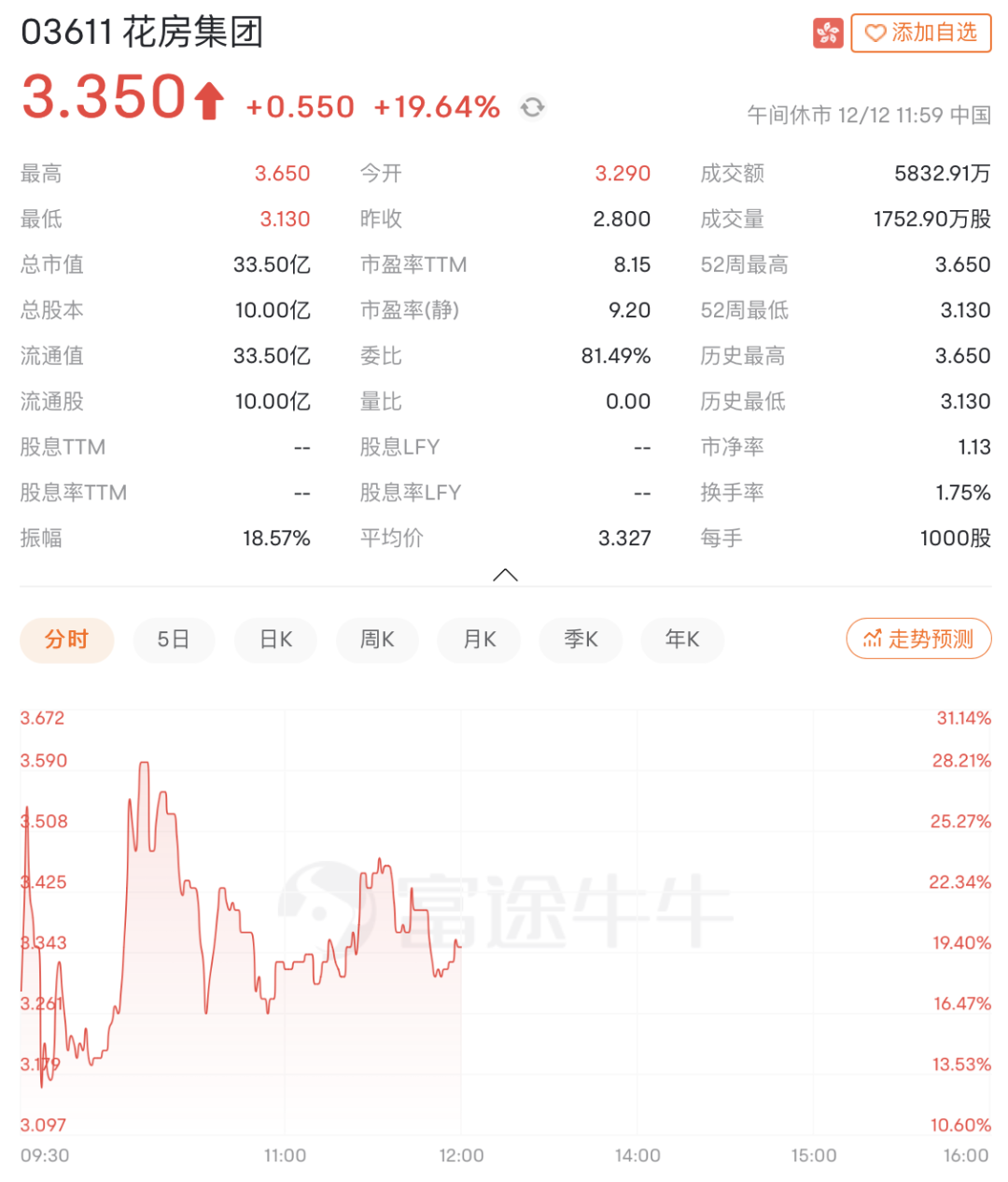 花房集团发行价为2.8港元/股,高开17.5%报3.29港元/股,市值达32.9亿港元。截至午间休市,花房集团涨19.64%报3.35港元/股,市值33.50亿港元。