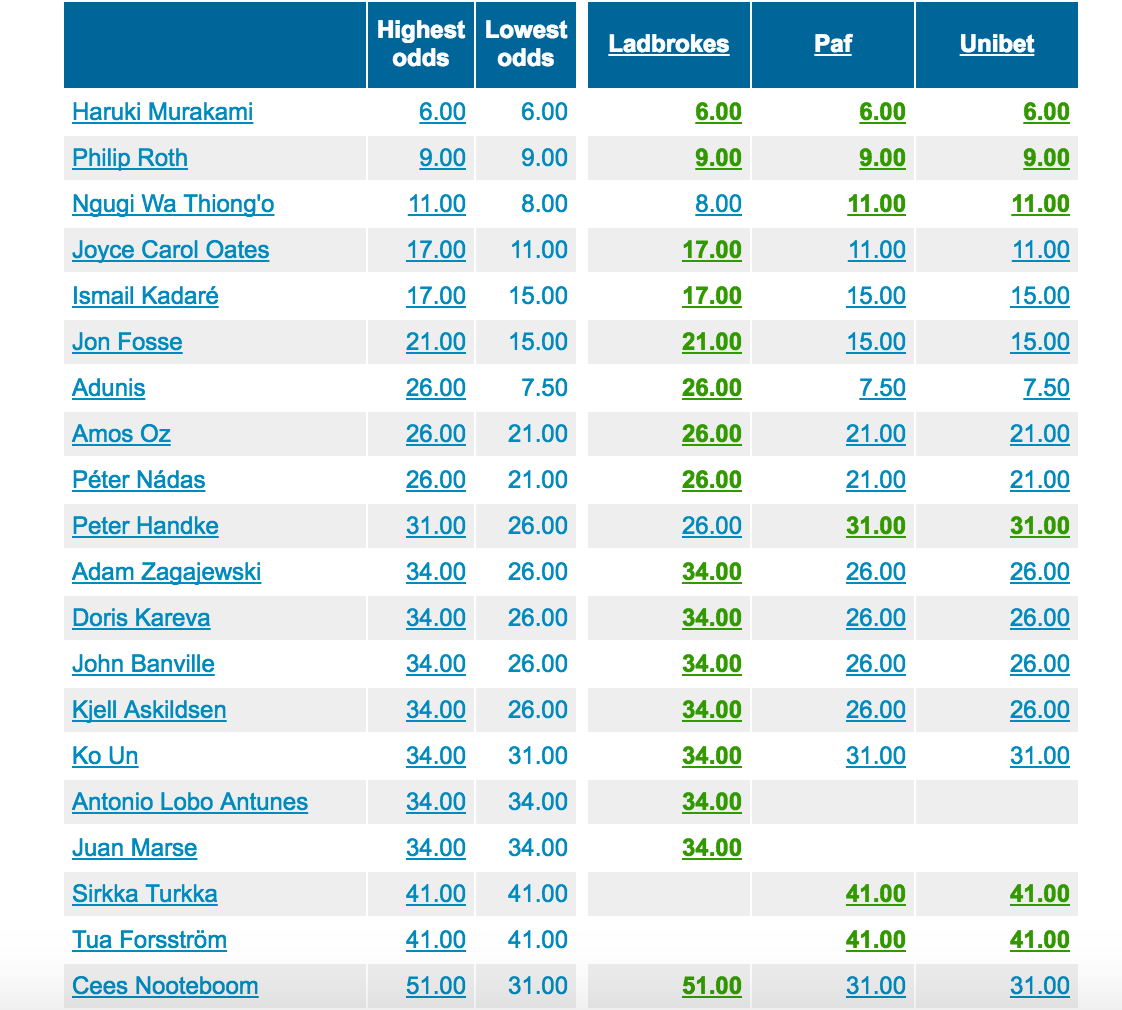 博彩公司Ladbrokes曾因压中莫言获奖而名声大噪,那么,赔率名单真的有用吗?“人们总是押村上春树(然而他们总是错的),事实上,获奖名单是完全保密的,谁能获奖是完全不可预测的。被押奖的作者总是比真正的获奖者要更传统、更著名、更值得获奖。阿多尼斯就经常被上榜,但是诺奖得主却经常是更有争议的(比如哈罗德·品特),更惊世骇俗的(比如耶利内克),或是更默默无闻的(比如克莱齐奥)。”2014年,《时代》杂志一篇题为《烦劳不要再押诺贝尔文学奖了》的文章这样写道。