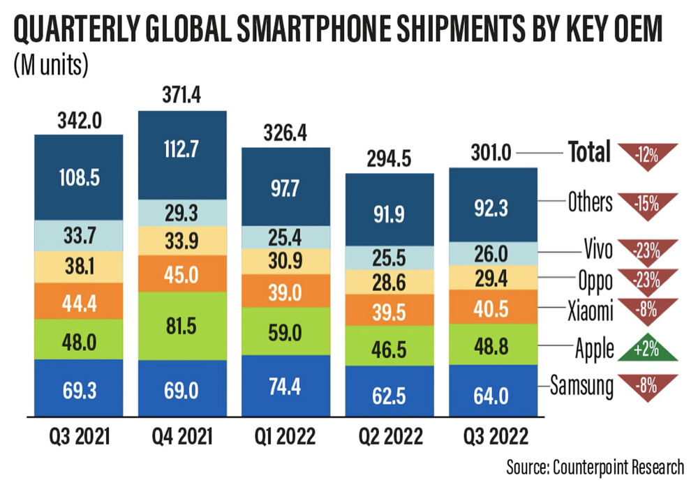 值得注意的是,2022 年的预计出货量相比 2021 年的 13.91 亿部出货量已经下跌了 11%,相比于比 2019 年的 14.71 亿部更是下跌 15%。