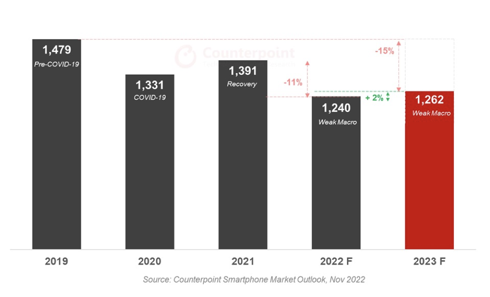 Counterpoint Research 表示,智能手机的出货量在 2023 年将下降2%,达到 12.62 亿部,而 2022 年的预估数字为 12.40 亿部。这与早先预测的明年出货量将同比增长 6% 相比有着较大的出入。