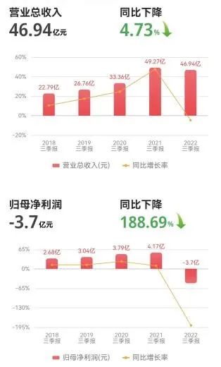 再譬如,蒙娜丽莎2022年前三季度的营业收入为46.94亿元,同比下降4.73%;净利润为-3.70亿元,同比下降188.73%。