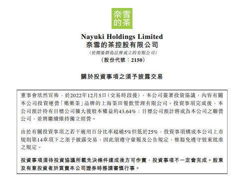 12月5日,奈雪的茶(以下简称“奈雪”)发布公告称,奈雪与乐乐茶签署了总对价为5.25亿元的投资协议。这一投资事项完成后,奈雪将以持股43.64%的身份成为乐乐茶第一大股东。
