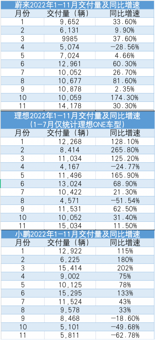 据时代周报统计,今年前11个月,蔚来月交付量有7个月同比增速在2%~38%,仅1个月实现交付量翻倍,还有1个月出现同比下滑。同期,小鹏和理想虽也面临部分月份交付量不振,但均有多个月份交付量翻倍增长。