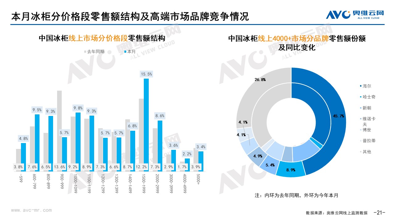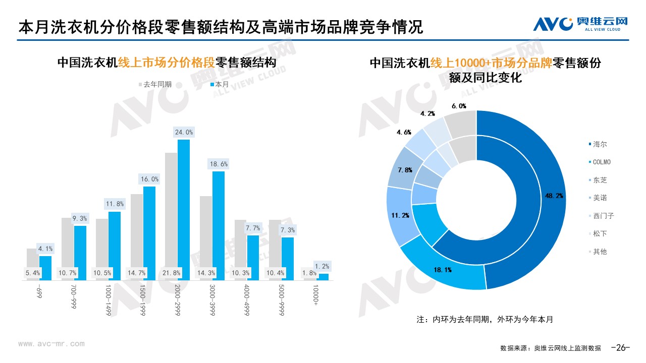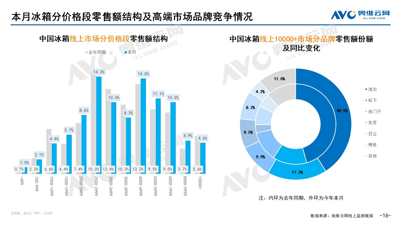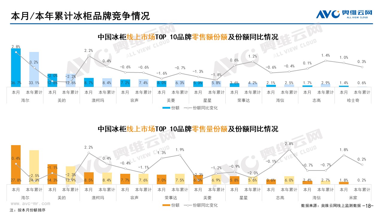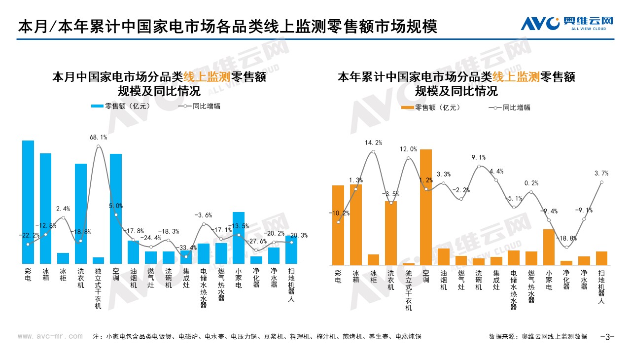 白电:据奥维云网(AVC)线上市场监测数据显示,本月白电各品类中,冰箱、冰柜、洗衣机、独立式干衣机和空调线上零售额规模同比分别为-12.8%、2.4%、-18.8%、68.1% 和5.0%;冰箱、冰柜、洗衣机、独立式干衣机和空调的均价分别为3026元、1180元、1803元、2916元和3174元,同比分别为3.0%、-0.2%、1.5%、-24.1% 和6.9%;各品类中,高端品零售额占比分别为4.6%、5.5%、1.2%、4.8% 和2.8%,同比分别为-1.0%、-0.1%、-0.6%、-5.0% 和-0.3%。