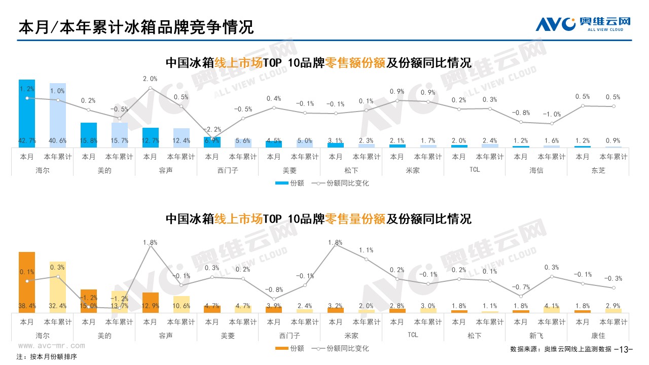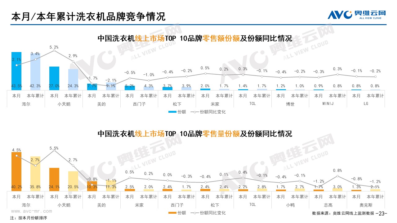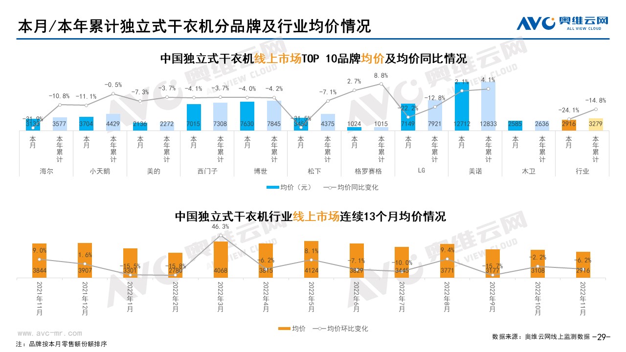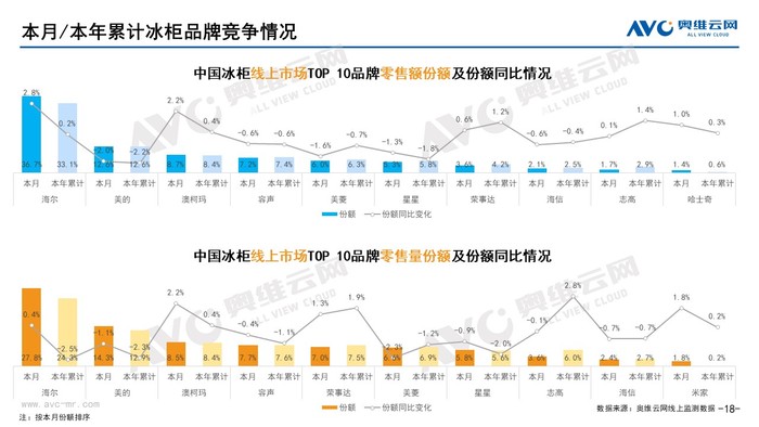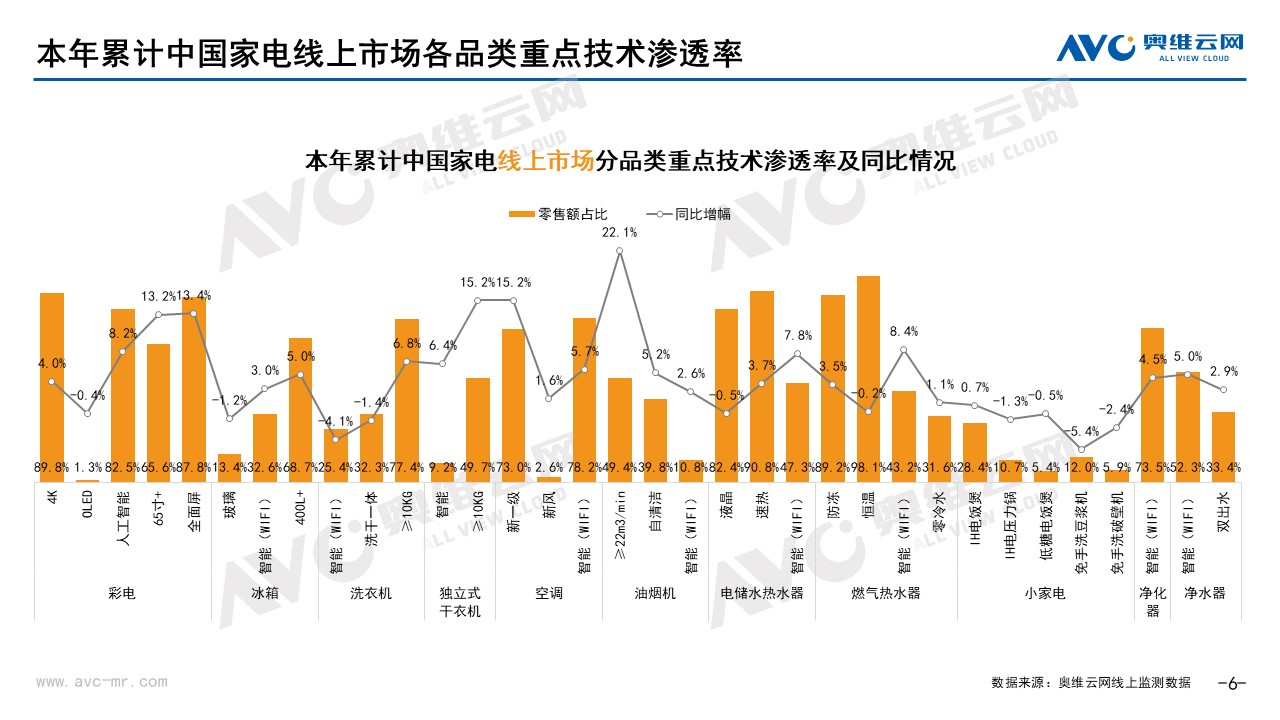 白电:据奥维云网(AVC)线上市场监测数据显示,本月白电各品类中,冰箱、冰柜、洗衣机、独立式干衣机和空调线上零售额规模同比分别为-12.8%、2.4%、-18.8%、68.1% 和5.0%;冰箱、冰柜、洗衣机、独立式干衣机和空调的均价分别为3026元、1180元、1803元、2916元和3174元,同比分别为3.0%、-0.2%、1.5%、-24.1% 和6.9%;各品类中,高端品零售额占比分别为4.6%、5.5%、1.2%、4.8% 和2.8%,同比分别为-1.0%、-0.1%、-0.6%、-5.0% 和-0.3%。