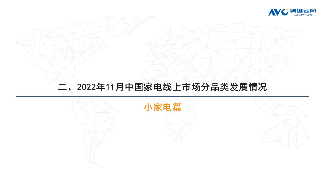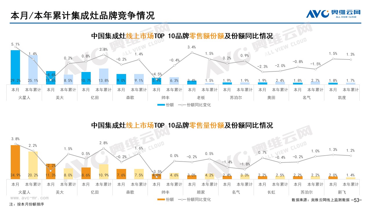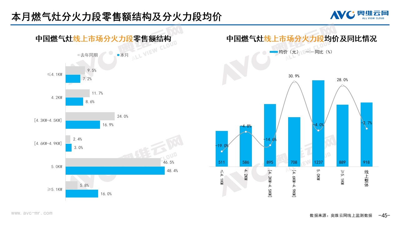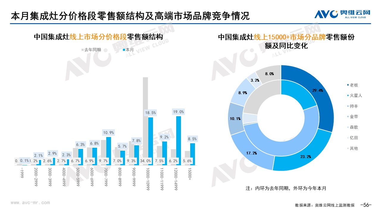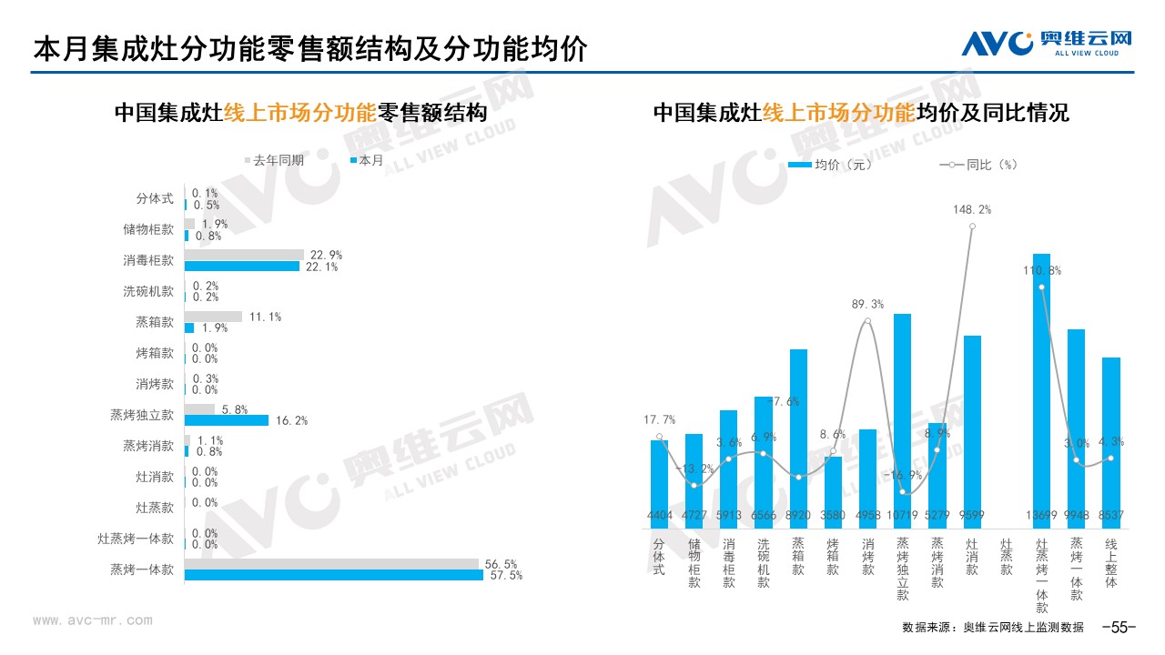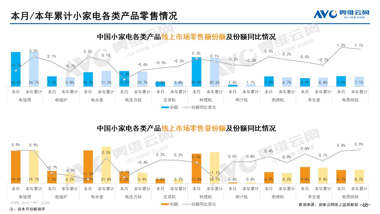 厨卫:据奥维云网(AVC)线上市场监测数据显示,本月厨卫主要品类中,油烟机、燃气灶、洗碗机、集成灶、电热和燃热的线上零售额规模同比分别为-17.8%、-24.4%、-18.3%、-33.4%、-3.6%和-17.1%;油烟机、燃气灶、洗碗机、集成灶、电热和燃热的均价分别为1695元、918元、4592元、8537元、1062元和1754元,同比分别为0.1%、-2.7%、10.1%、4.3%、-0.2%和-4.1%;各品类中,高端品零售额占比分别为0.9%、2.4%、10.4%、8.5%、0.5%和4.8%,同比分别为-0.6%、-0.5%、2.0%、2.9%、-0.3%和-3.4%。