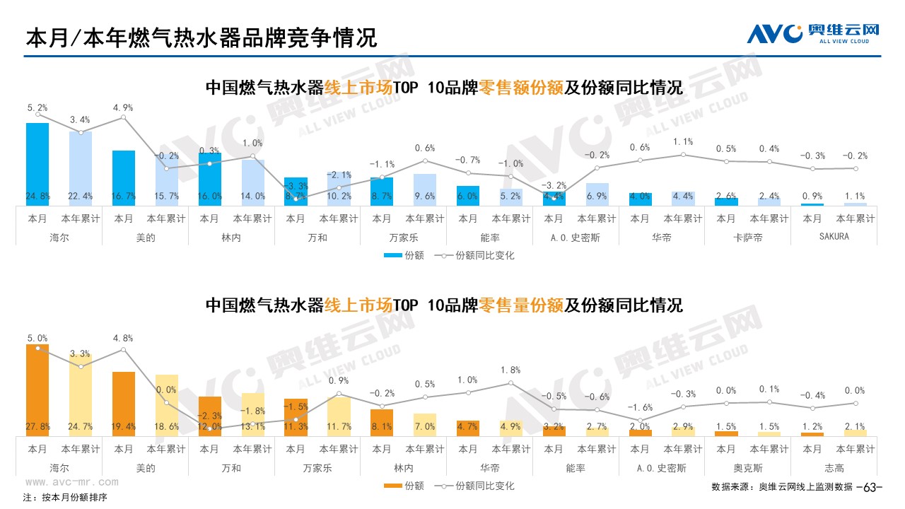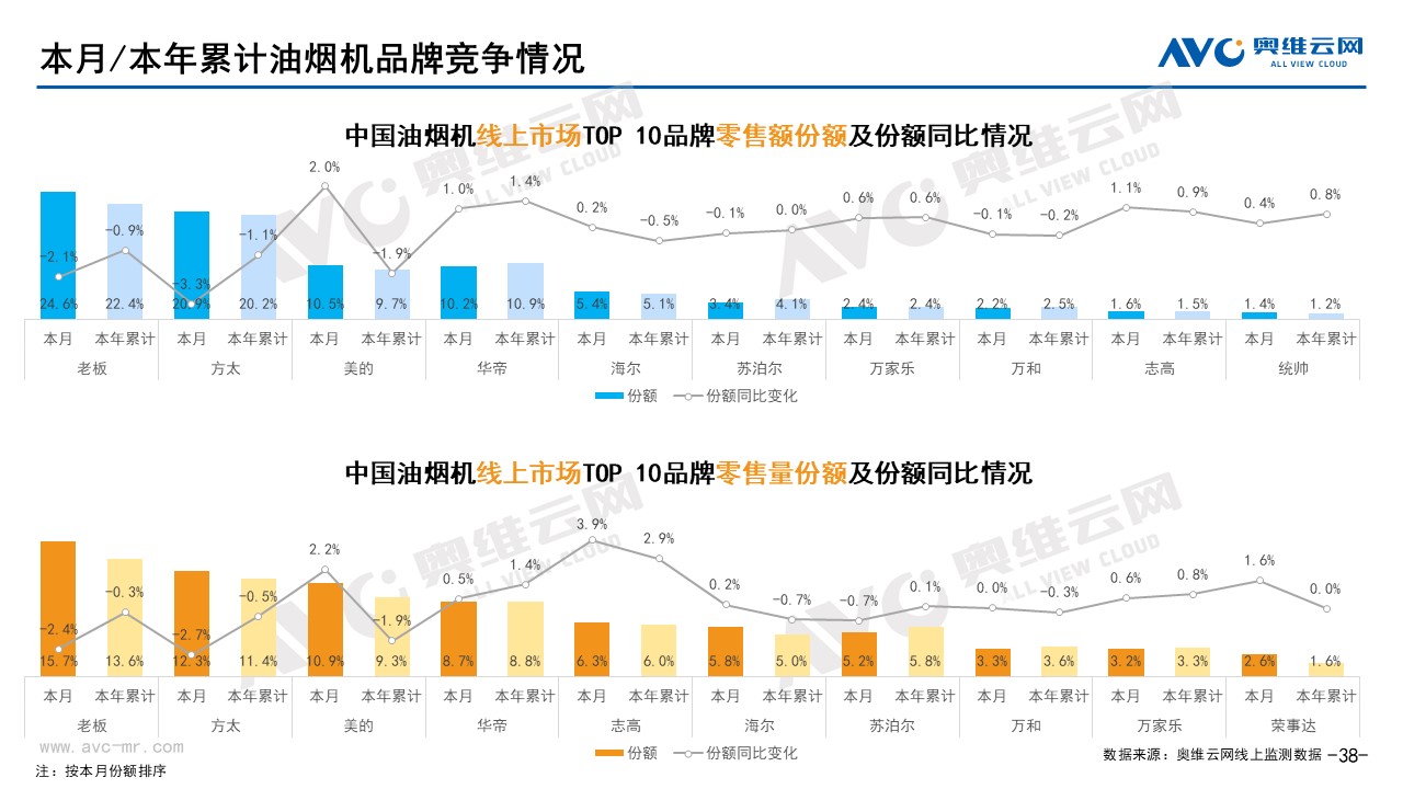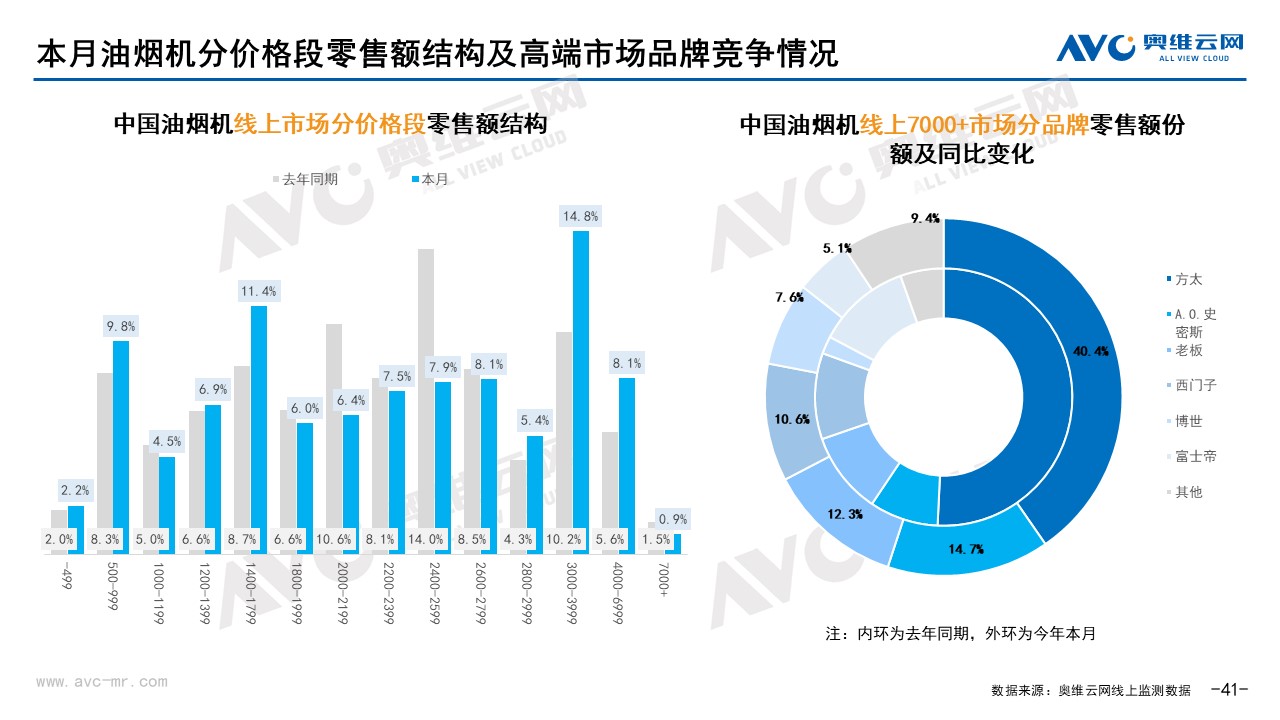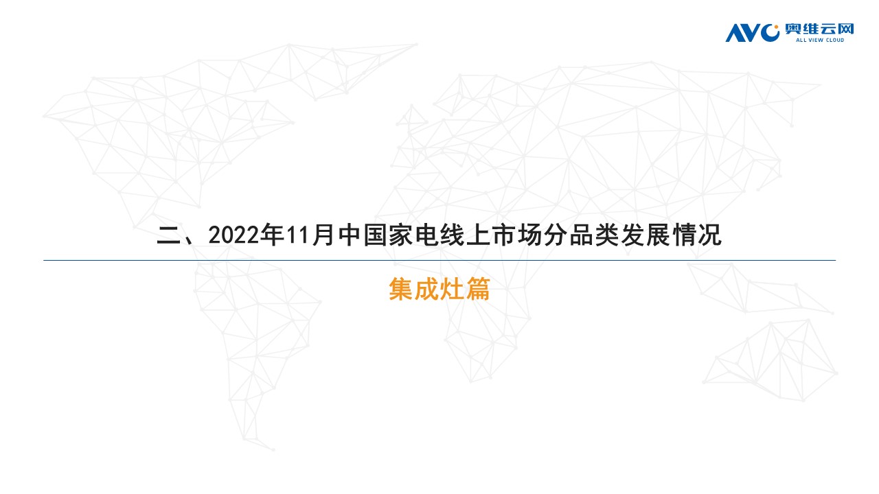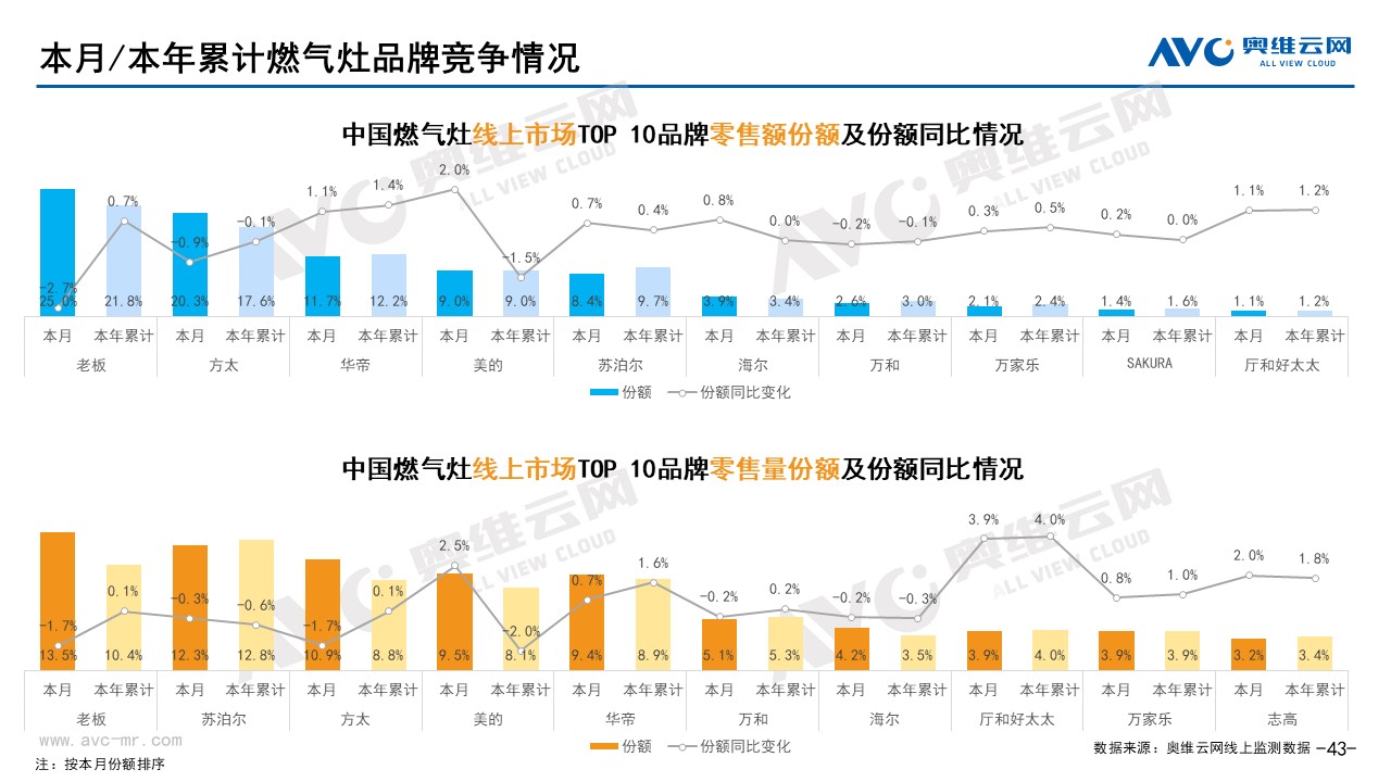 厨卫:据奥维云网(AVC)线上市场监测数据显示,本月厨卫主要品类中,油烟机、燃气灶、洗碗机、集成灶、电热和燃热的线上零售额规模同比分别为-17.8%、-24.4%、-18.3%、-33.4%、-3.6%和-17.1%;油烟机、燃气灶、洗碗机、集成灶、电热和燃热的均价分别为1695元、918元、4592元、8537元、1062元和1754元,同比分别为0.1%、-2.7%、10.1%、4.3%、-0.2%和-4.1%;各品类中,高端品零售额占比分别为0.9%、2.4%、10.4%、8.5%、0.5%和4.8%,同比分别为-0.6%、-0.5%、2.0%、2.9%、-0.3%和-3.4%。