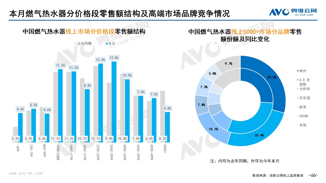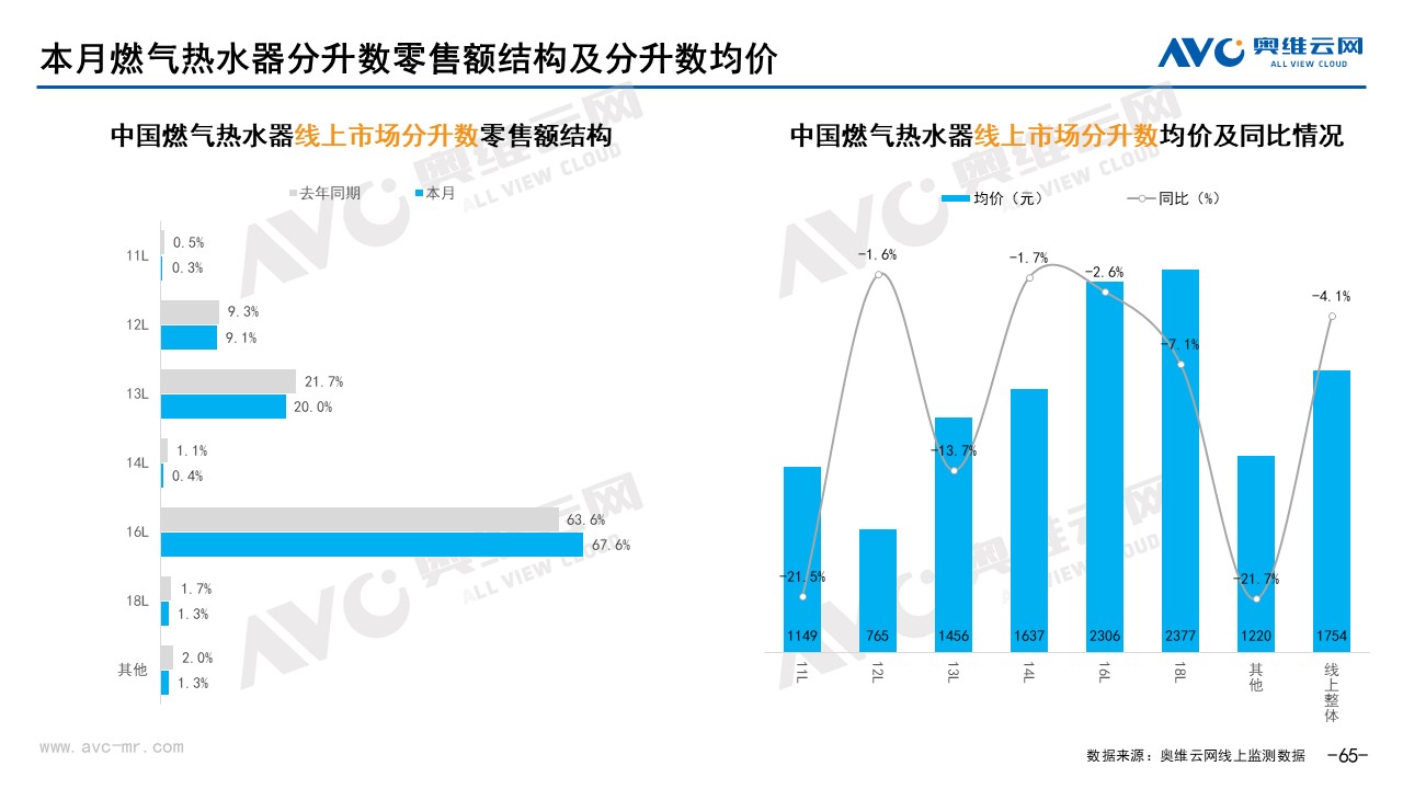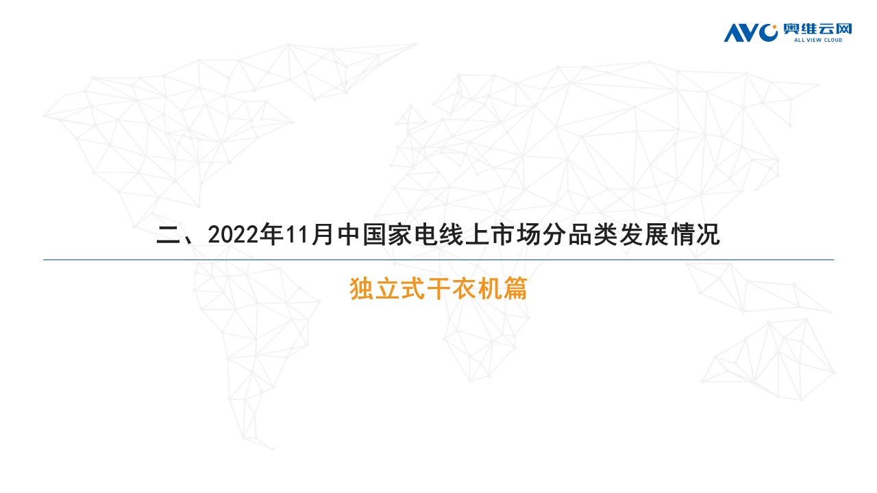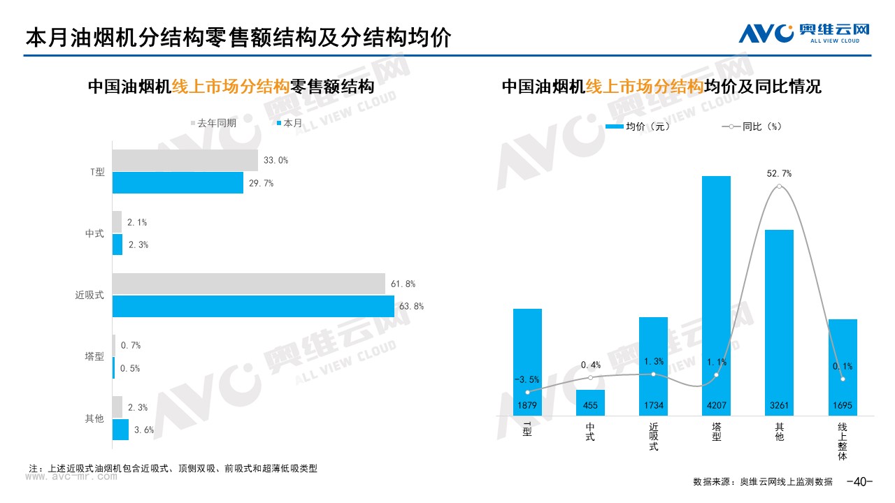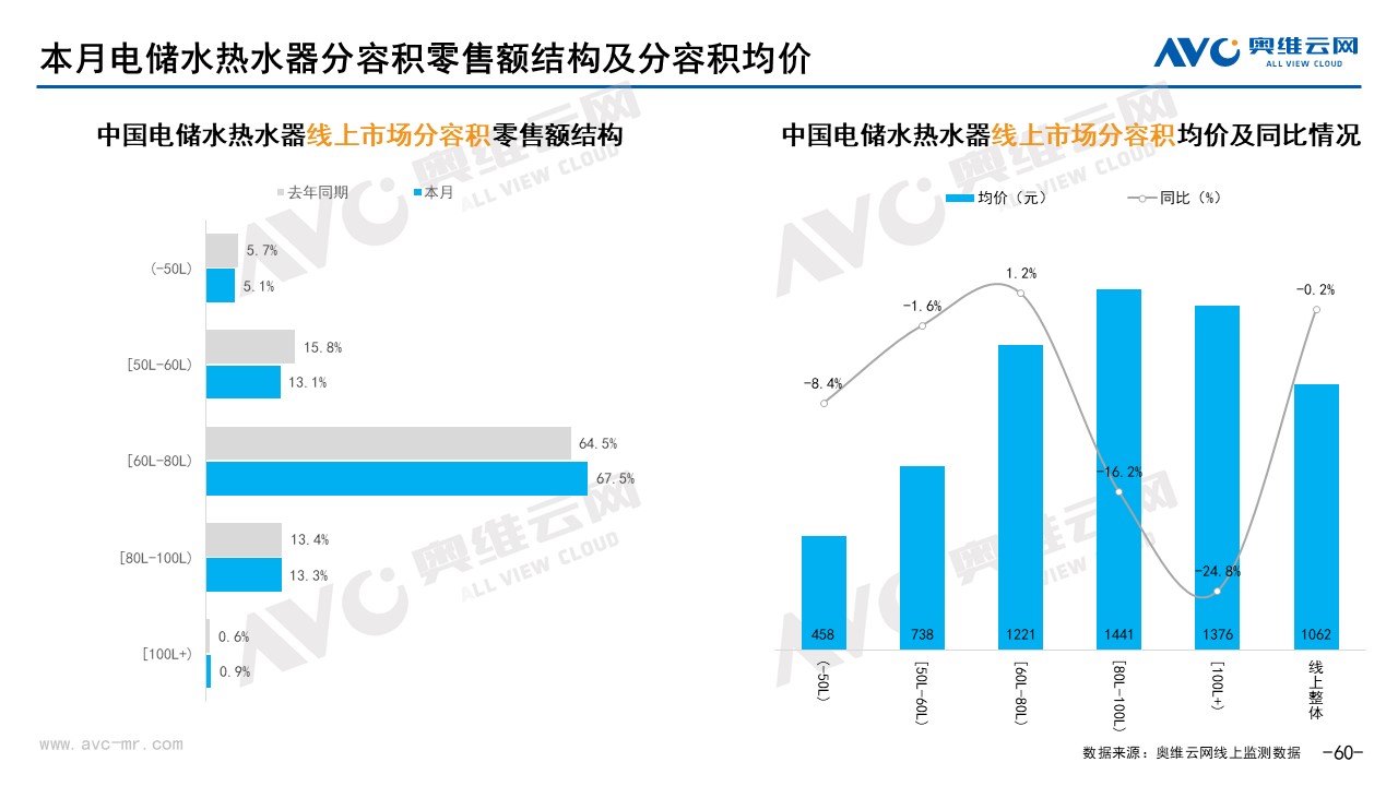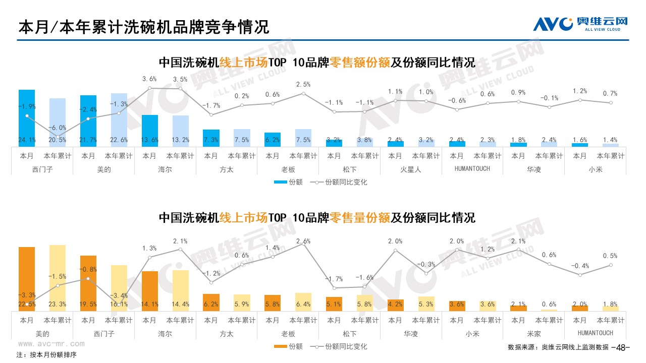 厨卫:据奥维云网(AVC)线上市场监测数据显示,本月厨卫主要品类中,油烟机、燃气灶、洗碗机、集成灶、电热和燃热的线上零售额规模同比分别为-17.8%、-24.4%、-18.3%、-33.4%、-3.6%和-17.1%;油烟机、燃气灶、洗碗机、集成灶、电热和燃热的均价分别为1695元、918元、4592元、8537元、1062元和1754元,同比分别为0.1%、-2.7%、10.1%、4.3%、-0.2%和-4.1%;各品类中,高端品零售额占比分别为0.9%、2.4%、10.4%、8.5%、0.5%和4.8%,同比分别为-0.6%、-0.5%、2.0%、2.9%、-0.3%和-3.4%。