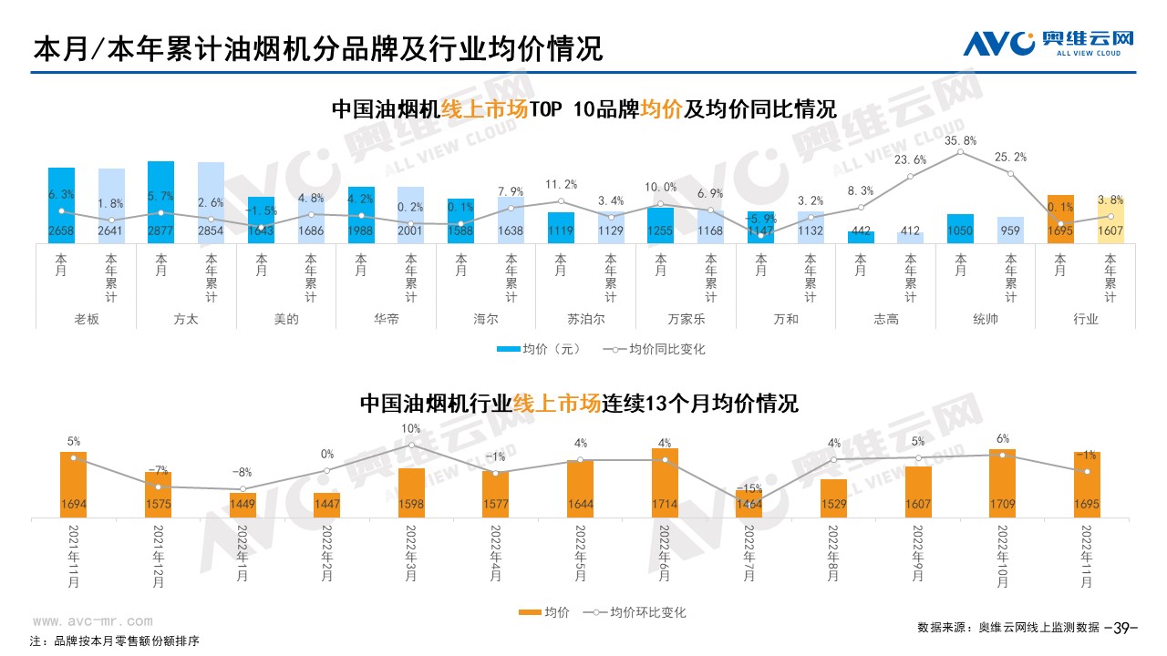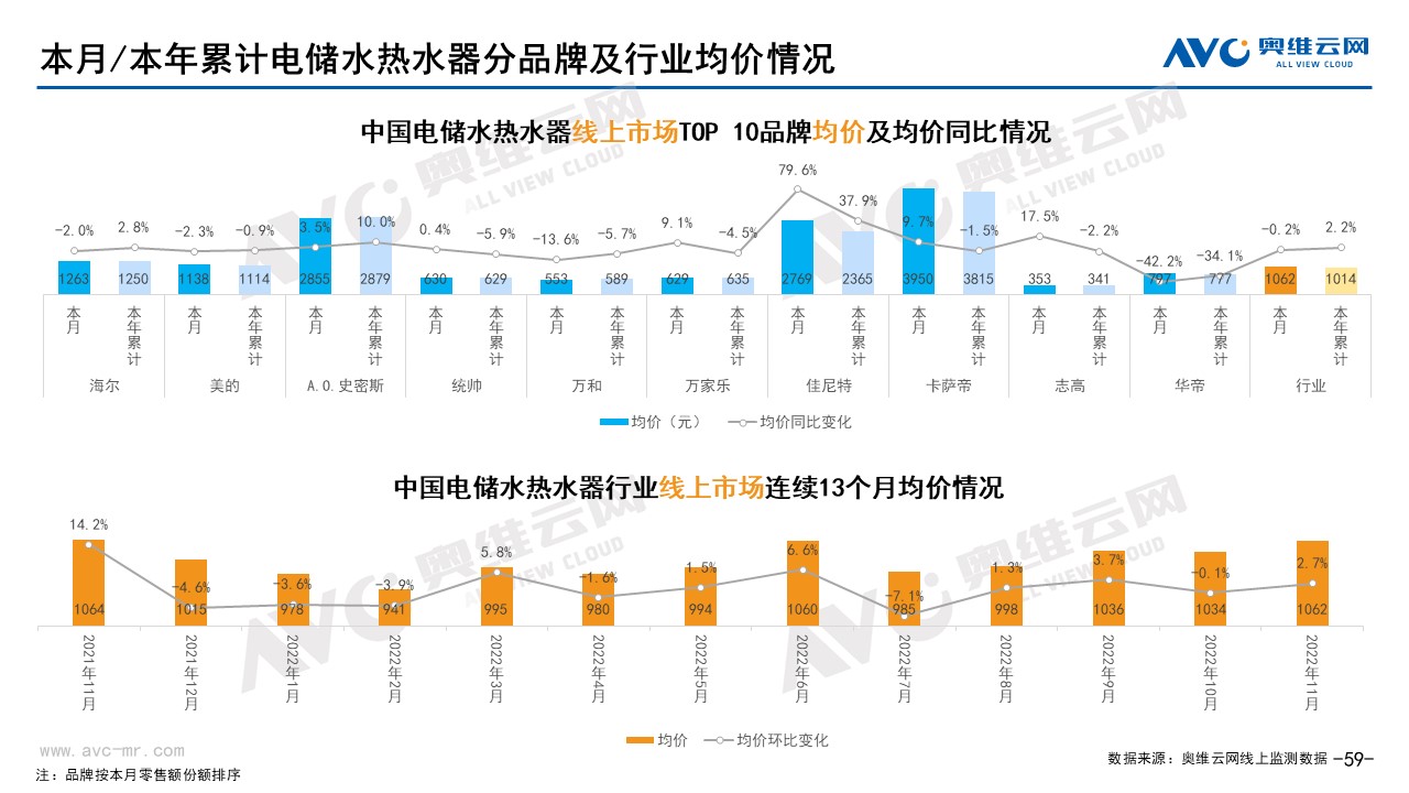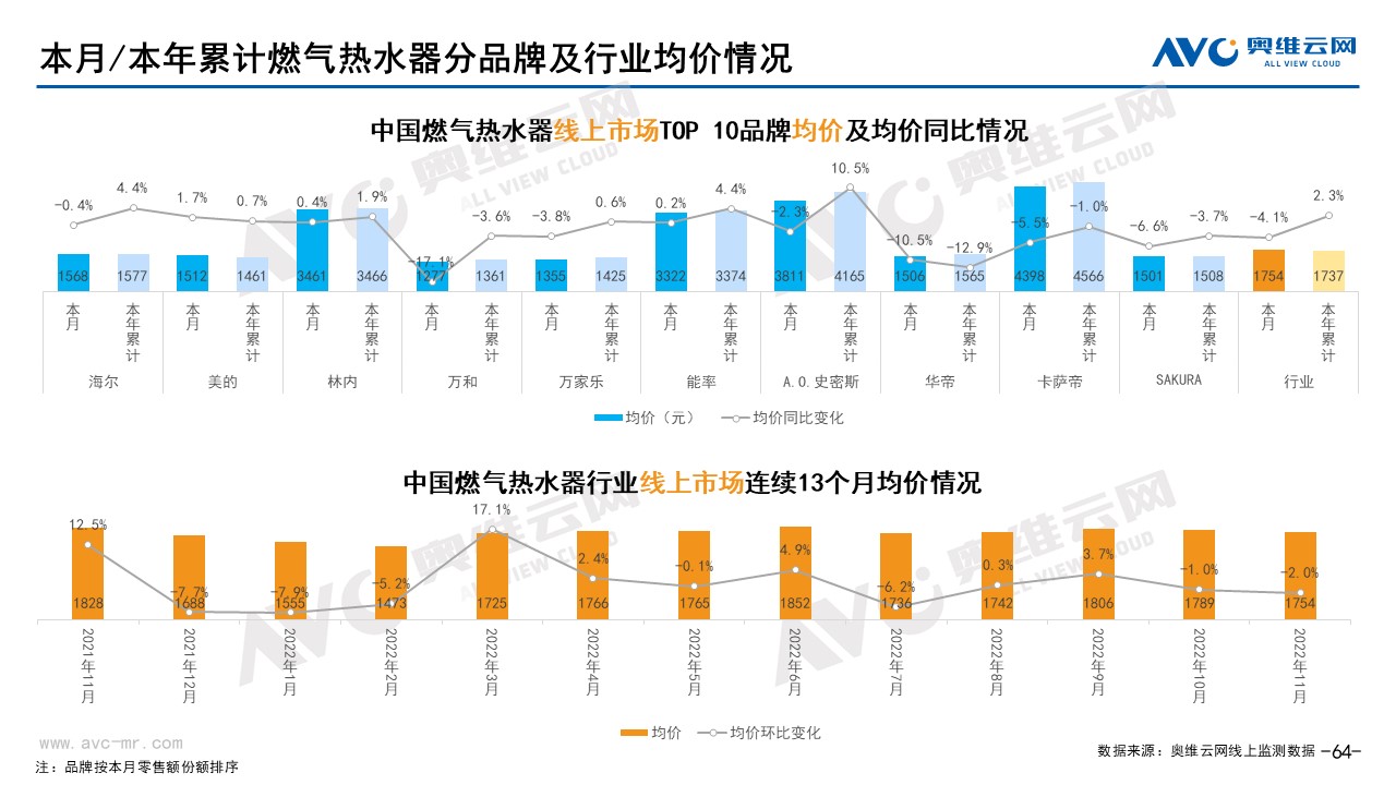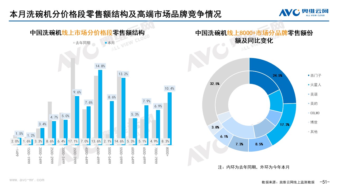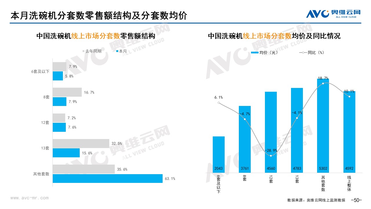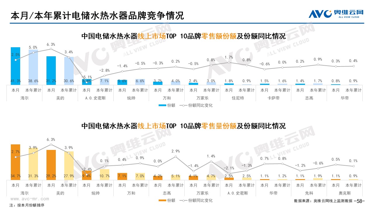 厨卫:据奥维云网(AVC)线上市场监测数据显示,本月厨卫主要品类中,油烟机、燃气灶、洗碗机、集成灶、电热和燃热的线上零售额规模同比分别为-17.8%、-24.4%、-18.3%、-33.4%、-3.6%和-17.1%;油烟机、燃气灶、洗碗机、集成灶、电热和燃热的均价分别为1695元、918元、4592元、8537元、1062元和1754元,同比分别为0.1%、-2.7%、10.1%、4.3%、-0.2%和-4.1%;各品类中,高端品零售额占比分别为0.9%、2.4%、10.4%、8.5%、0.5%和4.8%,同比分别为-0.6%、-0.5%、2.0%、2.9%、-0.3%和-3.4%。