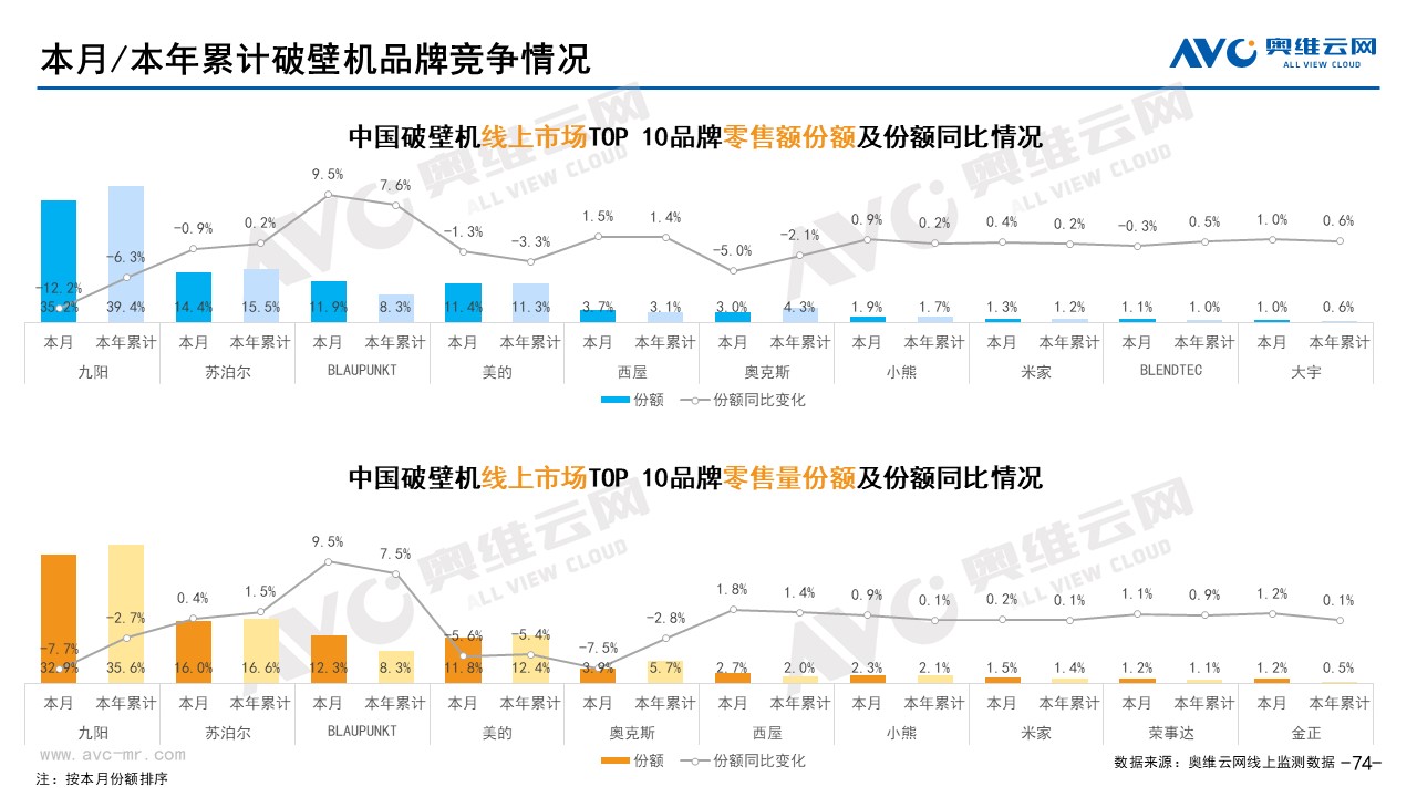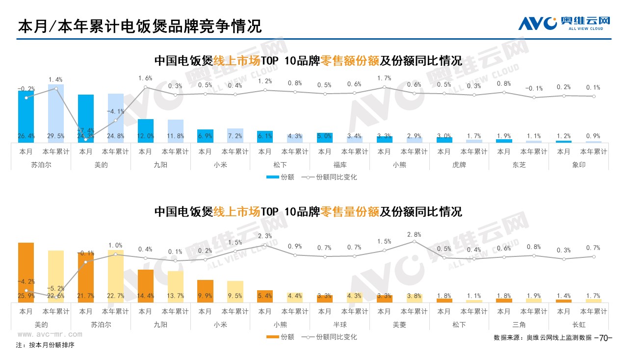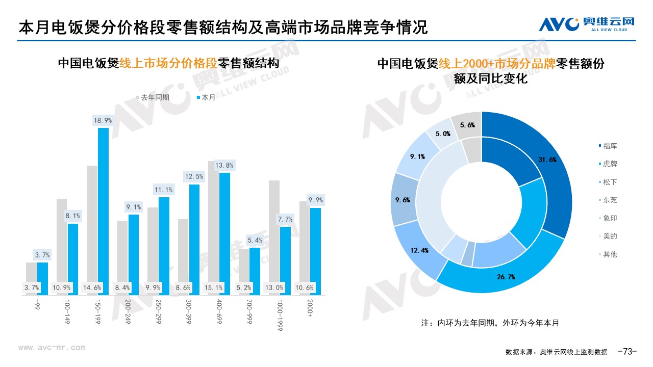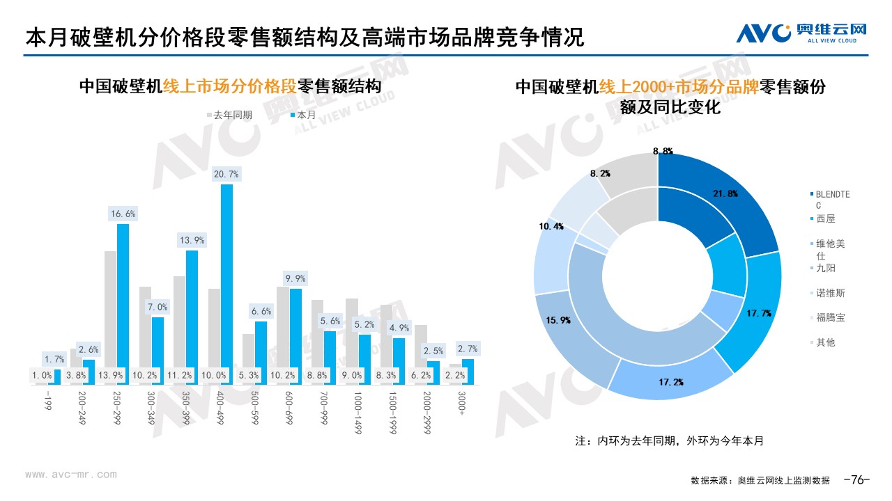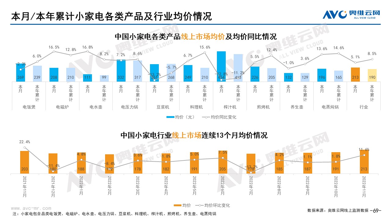 小家电:据奥维云网(AVC)线上市场监测数据显示,本月小家电线上零售额规模同比-13.5%;均价为213元,同比5.1%;高端品零售额占比4.1%,同比-0.9%;各品类中,电饭煲IH加热类型产品零售额占比34.7%,同比-8.1%;从价格段来看,2000+的电饭煲零售额占比9.9%,同比-0.7%,破壁机零售额占比5.2%,同比-3.2%。